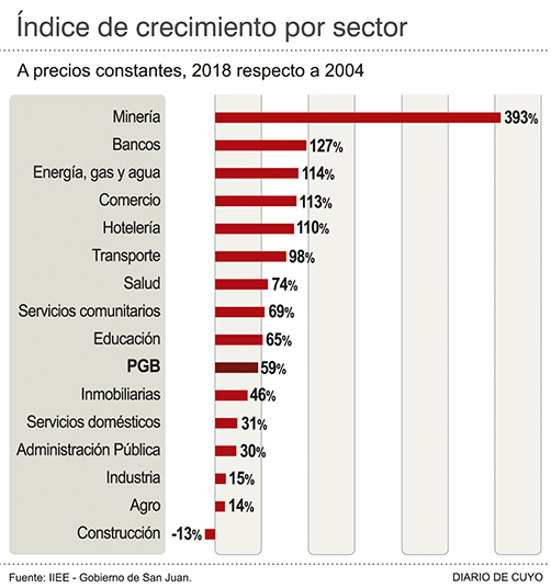 Entre los años 2004 y 2018, la economía de San Juan creció un 59% en términos reales, es decir, a precios constantes; y por lejos el sector "Explotación de minas y canteras" tuvo el mayor crecimiento, un 393%. En el extremo opuesto, "Construcción" es el único sector en disminuir un 13% (ver infografía) en el período. Esta caída va de la mano de la minería, porque en el 2004/2005 comenzó la actividad metalífera y la construcción de los grandes proyectos tuvo un apogeo que luego se diluyó hacia fines del periodo analizado, alcanzando en 2018 una participación del 11,6% respecto al 80% logrado en el 2004. En el IIEE explican que si se excluye el componente minero, el sector Construcción crece un 290% en términos reales entre 2004 y 2018. Así, pasaría a ser el segundo sector en importancia en términos de tasa de crecimiento a precios constantes, con la obra pública como principal componente.