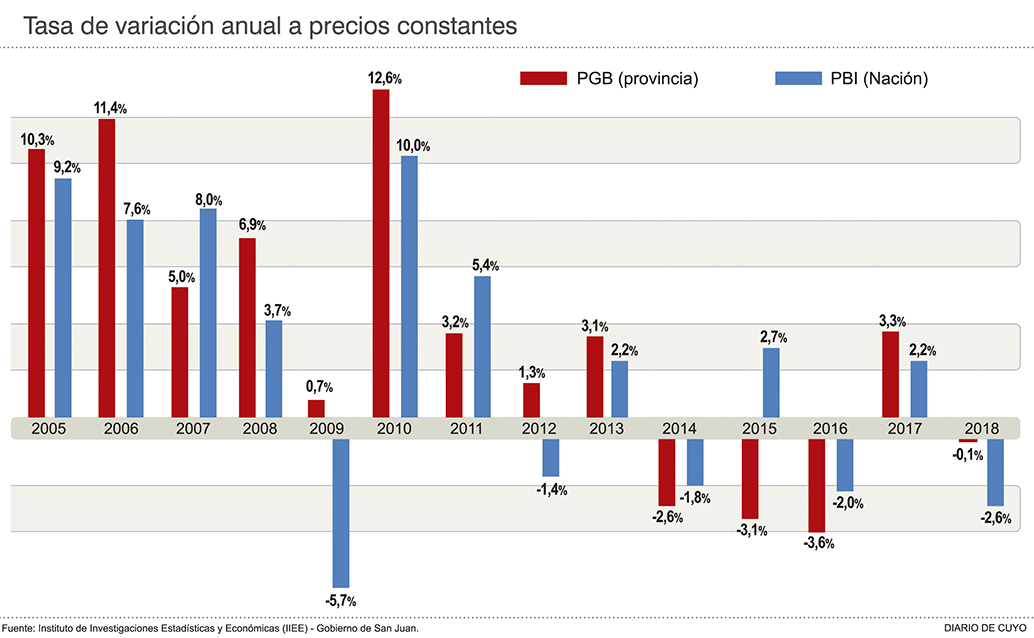 En el crecimiento de la economía local fue clave el desarrollo de la minería metalífera en San Juan. Eso se nota mucho entre los años 2005 y 2013, cuando la provincia creció más que la Nación (ver infografía). A fines del 2005 la mina Veladero comenzó a producir, y en el 2007 arrancó la mina Gualcamayo. Ambos proyectos mineros permitieron amortiguar en la provincia el efecto de la crisis económica y financiera mundial del 2008. En el 2009 por ejemplo la economía del país cayó 5,7% y San Juan creció 0,7%. Entre 2012 y 2013 San Juan vuelve a superar el crecimiento nacional gracias a los avances de construcción del proyecto Pascua Lama y su derrame sobre la industria y el comercio. Del mismo modo, cuando la minería decayó impactó en el PGB: entre 2014 y 2016 se suspendió y cerró Pascua Lama, y Veladero tuvo suspensiones temporales en su actividad debido a los dos derrames ocurridos. En 2017 San Juan volvió a superar en crecimiento a la Nación debido a una reactivación de la minería, comercio y servicios, y el año pasado por la recesión económica Nación cayó 2,6% mientras que la economía local apenas bajó 0,1%.
