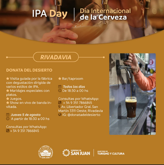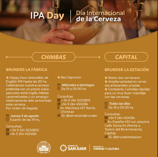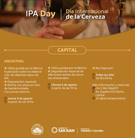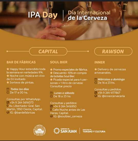 Bajo esta fecha popular en el mundo, el Ministerio de Turismo de San Juan difundió las actividades especiales que se programaron en las fábricas y bares de la Ruta de la Cerveza Artesanal de San Juan. Para los apasionados de esta tradicional bebida, habrá festejos que incluyen desde recorridos guiados, degustaciones y maridajes especiales, happy hour, además de shows de música en vivo.