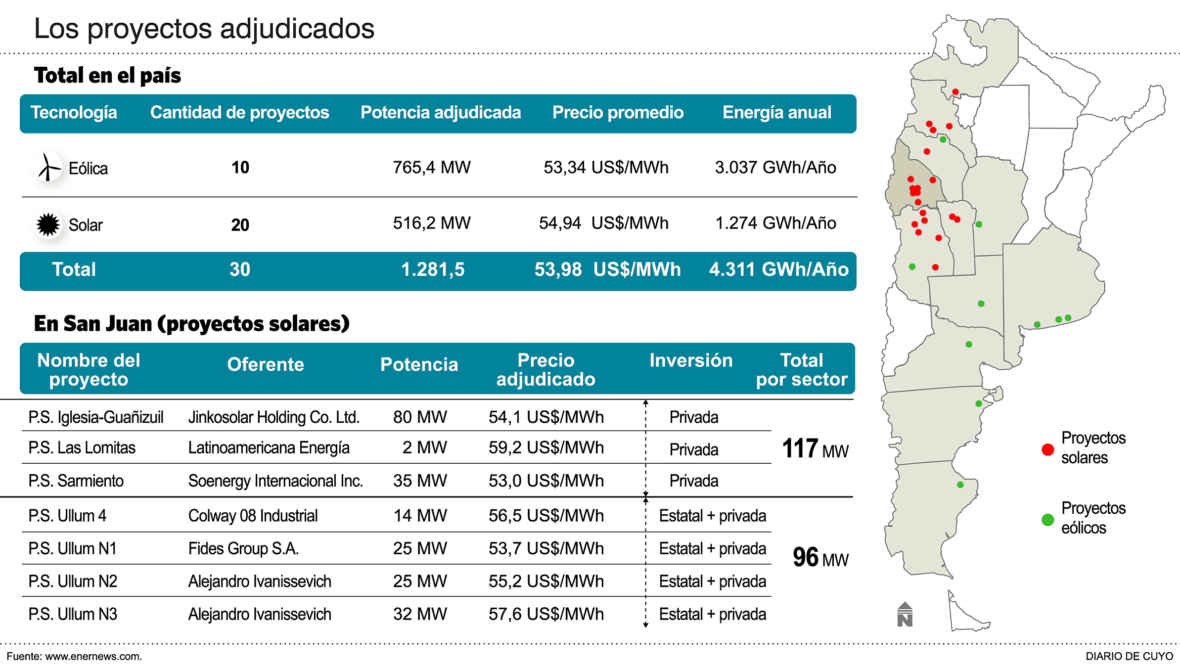 Pero además, este paso es fundamental para generar mano de obra en la provincia, dado que para hacer realidad estos proyectos se estima que se precisaran 1.000 obreros en el pico de construcción. Entre los proyectos (ver infografía) hay tres exclusivamente privados -Jinkosolar, Latinoamericana y Soenergy- y cuatro asociados con EPSE en Ullum, que se ubicarán en el mismo terreno donde el Gobierno ya posee la planta Solar I.