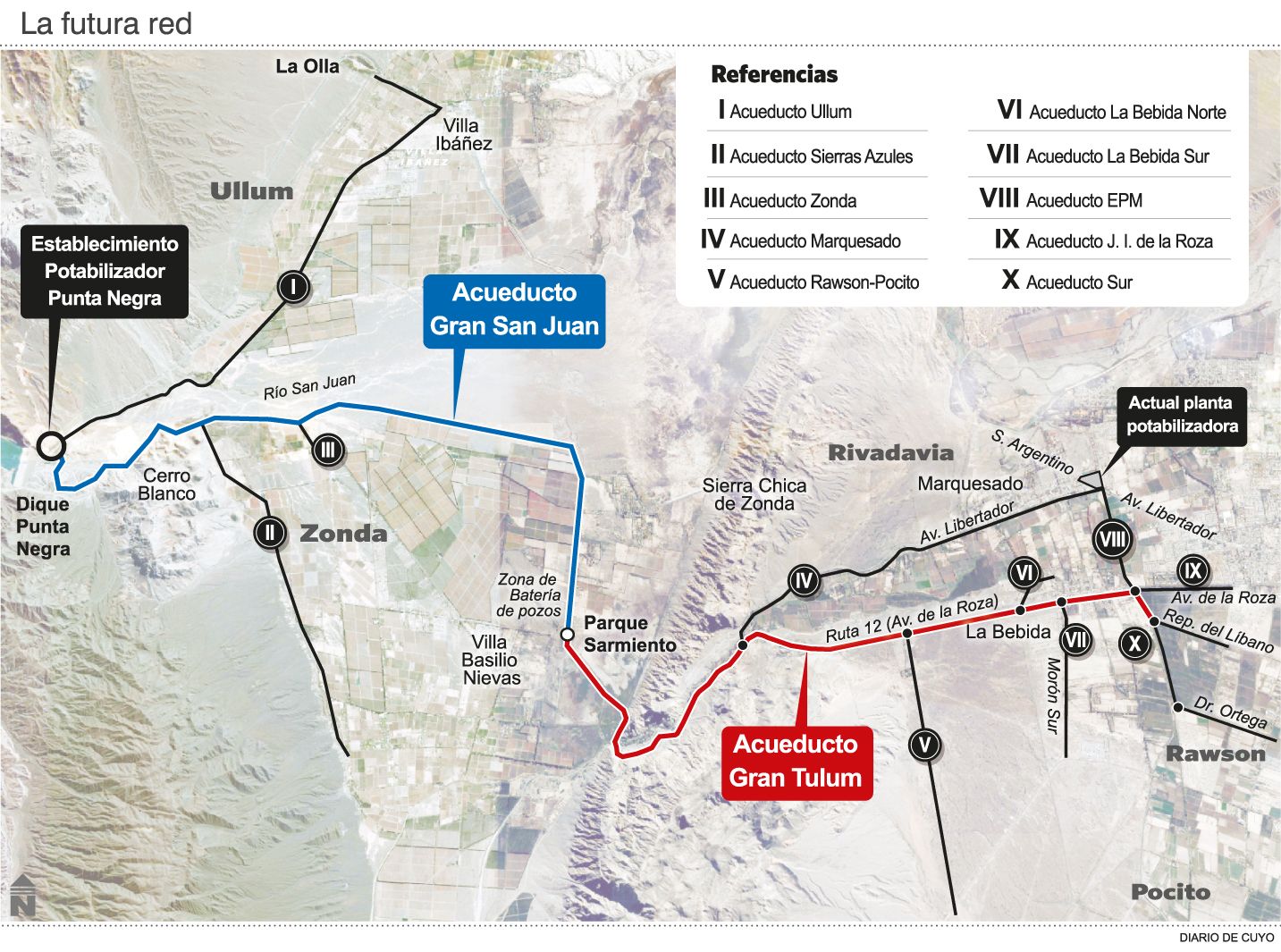 La obra reforzará la provisión del servicio de agua potable, tanto al Gran San Juan como a otras localidades que necesitan optimizarlo. También dotará a otros sectores que aún no lo tienen, como Villa Basilio Nievas, Villa Tacú y Sierras Azules en Zonda; Villa Ibáñez, en Ullum; Campo Sarmiento, Marquesado, La Bebida Norte y Sur, en Rivadavia; y sectores de Rawson y Pocito.