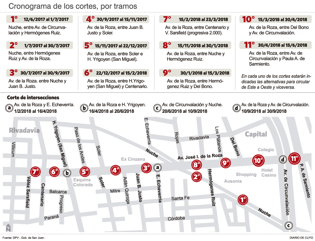 El plan fue presentado el viernes pasado en un encuentro con unos 120 vecinos en el salón Eloy Camus del Centro Cívico y con la presencia de representantes de la empresa y del Gobierno sanjuanino. Entre sus aspectos centrales, según explicó Magariños, incluye un total de 15 interrupciones del tránsito a lo largo de casi un año y medio.