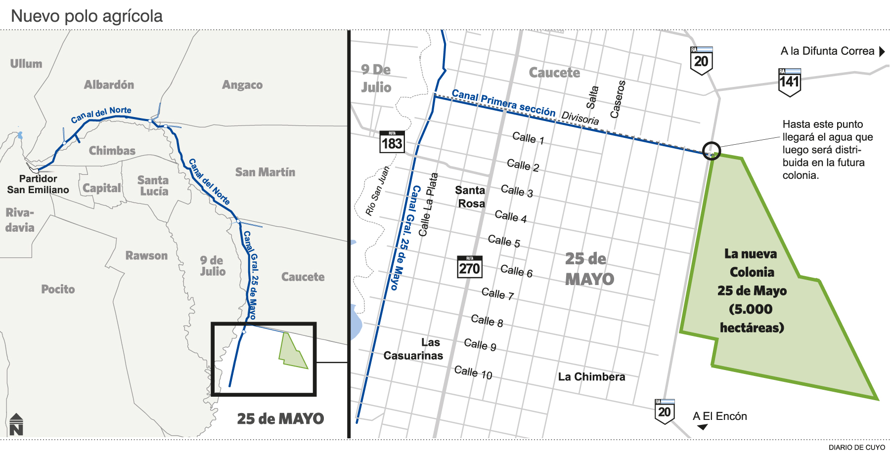 La provincia de San Juan da hoy un nuevo paso en su objetivo de ampliar la frontera agrícola y ganadera: se entregan 21 parcelas a productores y grupos inversores que recibirán en comodato por 10 años un total de 2.800 hectáreas del nuevo Polo de Desarrollo Productivo que fundó el Gobierno en tierras fiscales incultas, en medio del campo de 25 de Mayo. Están ubicadas en el extremo norte de ese departamento, entre las calles Divisoria y la ruta 20, a unos 40 kilómetros de la Ciudad de San Juan. La primera tanda de parcelas del proyecto oficial de la nueva colonia agropecuaria alcanza el 67% de la superficie del denominado que tiene un total de 5.100 hectáreas (ver infografia), y la entrega se realizará en la mañana de hoy en un acto en Casa de Gobierno con el gobernador Uñac. En la misma ceremonia también se entregará una batería de incentivos a la producción sanjuanina (ver recuadro). Entre las propuestas seleccionadas para ocupar los terrenos del polo productivo hay 50 hectáreas de álamos, 50 hectáreas de semillas, 250 hectáreas de tomate, 750 hectáreas de pistacho, 800 hectáreas para la producción ganadera, y 900 hectáreas para forrajes, anticipó el Ministro de Producción, Andrés Díaz Cano. Las parcelas que se entregan hoy han sido desmontadas, niveladas, se han construido callejones enripiados a lo largo de todo el terreno y cuentan con todos los servicios, incluida el agua de riego y la electricidad, a través de una inversión realizada por el gobierno provincial. Las obras están en la actualidad en un 90% de avance, explicaron las autoridades. ""Hemos construido cuatro perforaciones para dotar de agua a todo el terreno, el tendido eléctrico está casi listo; y va tanto por el costado de la ruta como a lo largo de la calle 4. Es decir, las tierras se entregan aptas para que los productores empiecen ya mismo a trabajarlas", explicó Díaz Cano. A partir del momento de la entrega de las parcelas, los beneficiarios tienen un plazo de seis meses para empezar a trabajar en las tierras, de lo contrario, pierden el beneficio y las parcelas serán reasignadas. Según el reglamento de creación de este nuevo polo productivo, una vez que los proyectos seleccionados cumplan el plazo de comodato de 10 años podrán acceder a la opción de compra y escrituración. Los seleccionados fueron elegidos por una comisión evaluadora con representantes del Ministerio de Producción, de Infraestructura y del INTA. Marcelo Balderramo, Director de Desarrollo Agrícola; explicó que el proyecto es un "Polo de desarrollo productivo" en vez de ""Colonia" porque a diferencia de ésta, no tendrá casas para los colonos, puestos sanitarios ni policía.