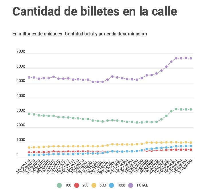 Sin embargo, si se mide en términos de valor, los 363 millones de billetes de $ 1.000 que se sacaron a la calle este año tuvieron un impacto mucho más importante. Fueron menos del 30% de los nuevos billetes lanzados pero explicaron casi un 500% del aumento de la circulación monetaria, al valor 10 veces más.