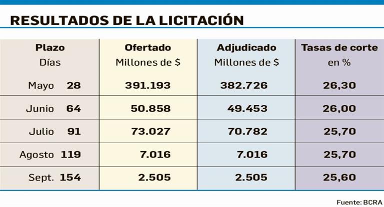 Las propuestas alcanzaron los $524.599 millones, de los cuales se adjudicaron $512.482 millones, lo que implicó la renovación parcial del vencimiento (un 87,3%), que era de $586.616 millones y una baja del stock en circulación por $74.134 millones y una expansión de la base monetaria de $89.000 millones.
