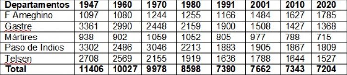 La tabla da cuenta del proceso de despoblamiento, que es consecuencia del debilitamiento y la falta de innovación en las economías regionales de la meseta que desde fines del siglo XIX estuvo centrada en la ganadería ovina extensiva concentrada en muy pocas manos. Por otro lado, entre 1960 y 1970, se da un incremento demográfico a partir de las políticas de promoción industrial en el departamento de Rawson que se consolida como un polo de la industria textil. Esto constituyó un fuerte factor de atracción de la población de la meseta, sin embargo esas actividades comenzaron a decaer a partir de la década de 1990.