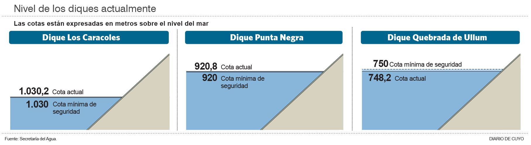 Para el actual período, el consejo estableció que el nivel mínimo de seguridad para el dique de Ullum es de 750 msnm, para Punta Negra de 920 msnm y para Caracoles de 1.030 msnm. Sin embargo, según datos oficiales, sólo los dos últimos diques están a ese nivel, mientras que Ullum está por debajo, a 748,2 msnm (ver infografía).