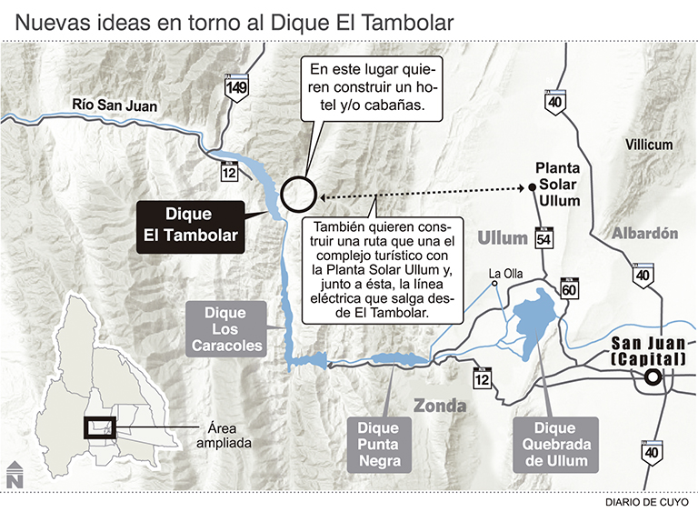 La construcción de la represa hidroeléctrica El Tambolar -cuya firma de contrato de inicio de obra se realiza hoy con la empresa ganadora de la licitación- viene con sorpresa, porque el Gobierno provincial quiere hacer allí un nuevo polo turístico y comienza las negociaciones necesarias con la empresa constructora y con la Nación para lograrlo. La idea es que el campamento que se debe levantar junto al lugar donde se construirá la represa no sea temporal como se hace usualmente. En cambio, quieren reemplazarlo por un grupo de cabañas, un hotel, o ambos; para alojar a los constructores mientras dure la obra y en el futuro para ser concesionado a un operador turístico, aprovechando el fenomenal marco de montañas y agua que ofrece la zona. Ese complejo se ubicará del lado del cauce del río San Juan en el departamento Ullum (ver infografía). La intención es replicar a la ex villa Paolini que se construyó cuando se hizo el dique Cuesta del Viento, y que ahora es un grupo de 36 cabañas, un hotel y comedor para 120 personas que maneja un privado bajo el nombre de Estancia La Vicuñita, en Iglesia. Al proyecto del complejo de alojamiento se le añade la construcción de una nueva ruta de 40 kilómetros en vez del camino de servicio requerido para la línea eléctrica que llevará la electricidad que genere el futuro dique hasta el parque solar Ullum, y también la eventual ampliación del campamento de Tocota, en Calingasta, al que también quieren reemplazar por casas o cabañas para darle otro uso dentro de 5 años, el plazo estimado para que se termine la represa. El plan fue confirmado por el presidente de Energía Provincial Sociedad del Estado (EPSE), Víctor Doña, quien agregó que ahora se comenzará a estudiar y negociar contractualmente como se va a encarar. Puede ser con una ampliación de obra o quizá se requiera un nuevo llamado a licitación para completar algunos de los aspectos. "’En términos generales, vamos a tratar de ver la sinergia de todos esos proyectos adicionales al Aprovechamiento Hidroeléctrico Multipropósito El Tambolar”, anticipó a DIARIO de CUYO el funcionario.
