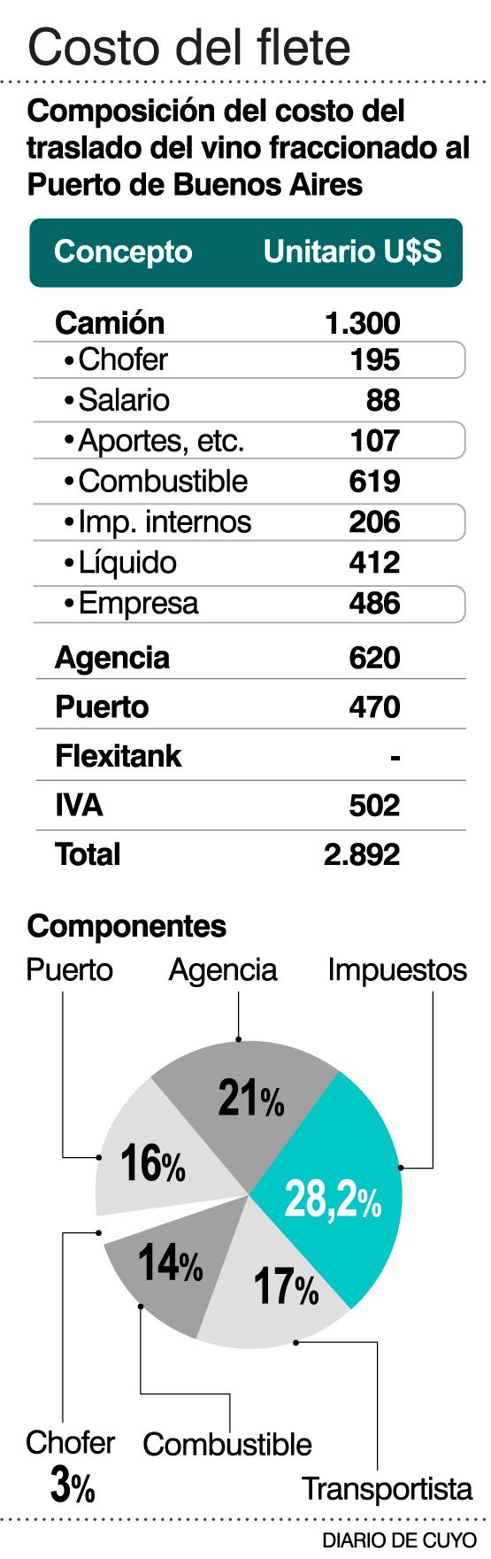 ‘Le echan la culpa a que el flete es muy caro, pero al sacar cuentas no incide tanto. Un camión a Buenos Aires que lleva 25 mil botellas, destina 1 peso por botella al transporte, y no incide tanto 1 peso en el valor de una botella’’ expresó José Maldonado, titular de Unión Propietarios de Camiones. En cambio, el empresario convocó a mirar los altos costos que debe afrontar una transportista. ‘Lo que pasa es que de cada 100 pesos que se cobra, 40 se los lleva el Estado’’ agregó. En efecto, al mirar el costo específico que tiene el camión, los datos señalan que alrededor del 40% de los costos corresponden a impuestos, IVA, impuesto a los combustibles, aportes, contribuciones, seguro vida, ART y sindicato.