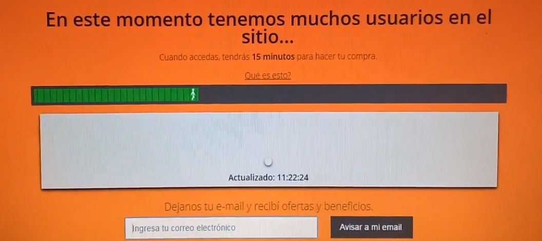 Justamente esa demanda saturó algunos sitios y generó un nuevo fenómeno: “las colas virtuales". Hay empresas que hacen esperar a los consumidores para poder ingresar y comprar. En ese proceso aparece un gráfico en el que un muñequito avanza a medida de que pasa el tiempo y se acerca el turno.