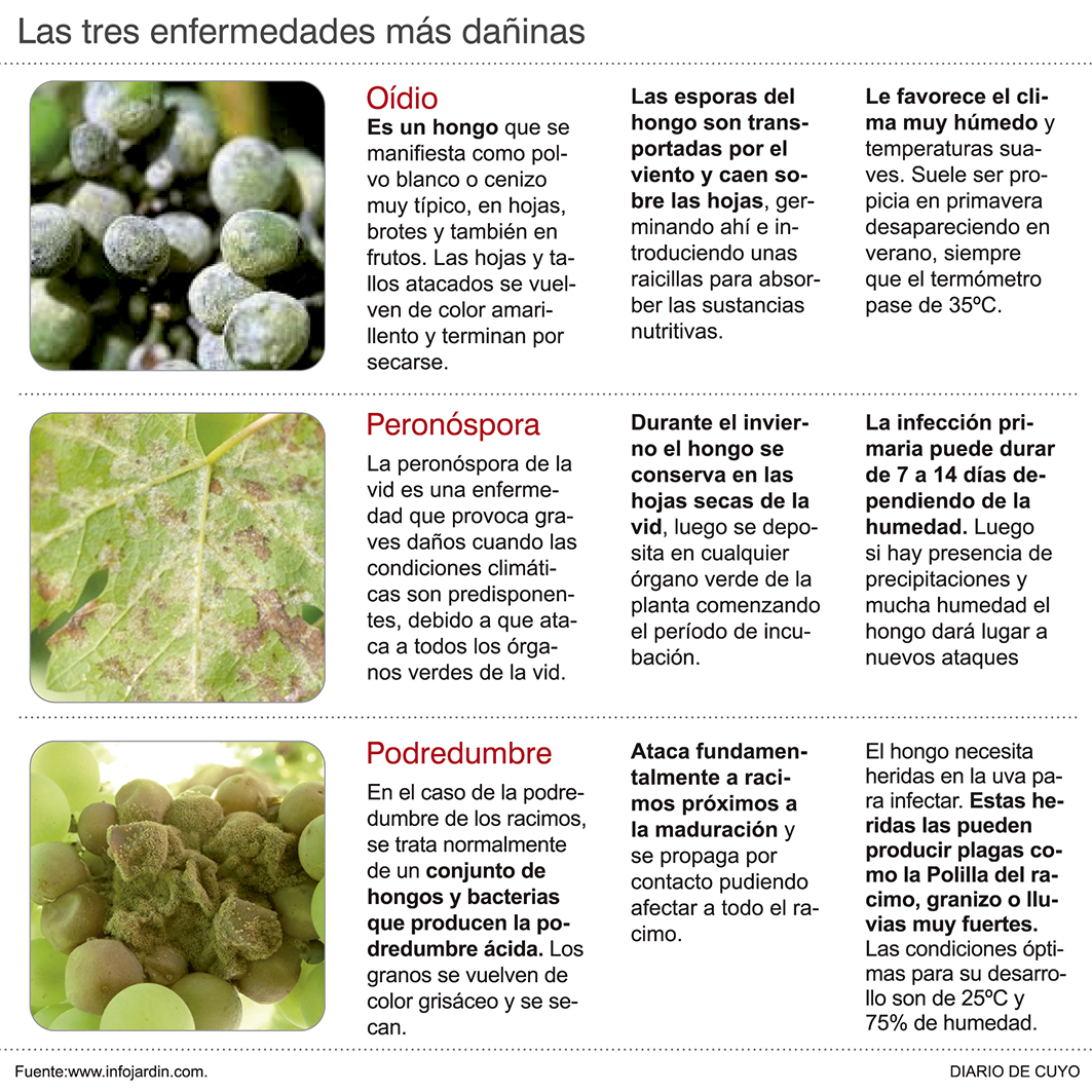 La alta humedad y los niveles inusuales de lluvias registrados en San Juan en los meses de febrero y marzo causaron finalmente lo que se temía, daños por enfermedades en los viñedos. Desde el Instituto Nacional de Tecnología Agropecuaria, el especialista en vid, Rodrigo Espíndola; informó que los últimos acontecimientos climáticos ya han generado focos de peronóspora en viñedos de seis departamentos: Ullum, 25 de Mayo, Caucete, 9 de Julio, Albardón y Angaco. Eso es porque las condiciones ambientales en los dos meses resultaron excepcionales: solo en un día de febrero llovió lo de todo un mes, y la última lluvia, granizo y crecientes del 1 de marzo hace 14 años que no se veía, afirman productores y funcionarios. La peronóspora es un hongo que afecta las partes verdes de la planta y causa problemas no solo ahora sino en la próxima temporada si los productores no toman las medidas protectivas. Al respecto, Espíndola comentó que hay productores que han decidido hacer tratamientos sanitarios para terminar un ciclo con menor carga de la enfermedad, pero que también hay otros que simplemente, ante un contexto económico recesivo y la falta de agua que se padece este año han decidido no hacer tratamiento fitosanitario, "lo que puede tener una consecuencia perjudicial para las plantas si la hoja se cae de modo anticipado porque reduce el nivel de contenido de reservas para el próximo año", explicó. El experto explicó que sin hojas, la planta de vid no termina de migrar todas las sustancias de reservas hacia troncos y raíces la vid, que son las que se utilizan para la brotación, lo que redundará en la próxima temporada en menor producción.