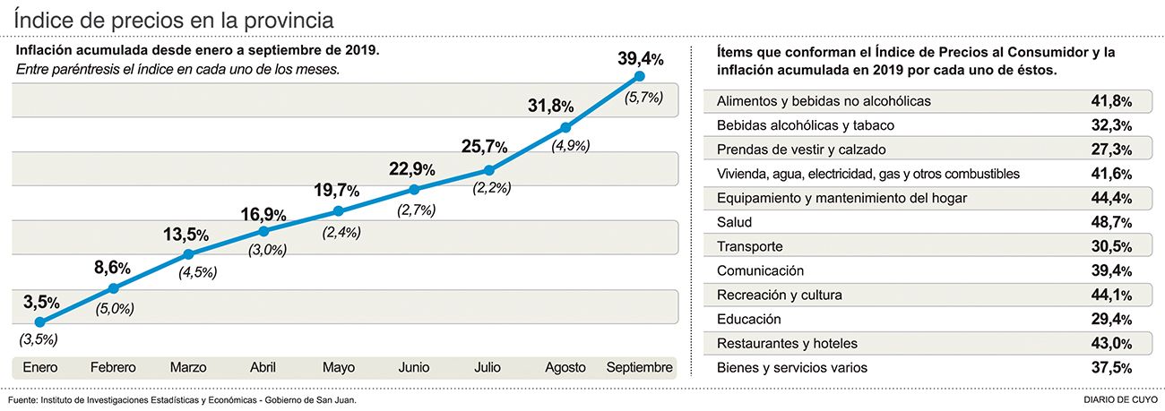 El Índice de precios al Consumidor (IPC) del mes pasado fue del 5,7% en San Juan, levemente inferior al 5,9% que midió el INDEC en el país, pero entre enero y septiembre la suba de precios acumulada se ubicó en 39,4% y fue más alta que la de la Nación que alcanzó 37,7 % en el mismo período.