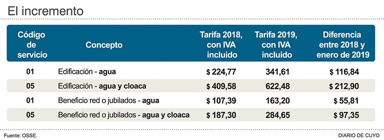 El aumento es alto, el mayor en 11 años, y parejo. Y por primera vez en todo ese tiempo, no garantizan que sea el único ajuste del 2019. Desde ayer rige para los 725.312 usuarios de San Juan una nueva tarifa que incrementa en casi un 52 por ciento el costo del servicio. Un usuario residencial que tenga el servicio de agua desde este mes comenzará a pagar $341.61 en lugar de los $ 224,77 anteriores, y trepa a $622,48 si cuenta además con cloacas. O sea, tendrá que destinar $116,84 y $212,90 más según cada caso, que lo que pagó el mes pasado.