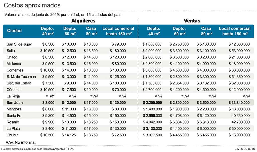 Alquilar un departamento de un dormitorio en San Juan, de unos 40 m2, costaba en enero pasado 6.000 pesos en promedio y el junio el monto trepó a los 8.000 pesos, es decir que hubo un incremento del 33% en 6 meses. A pesar de la suba, el valor sigue estando, al igual que en el primer mes del año, entre los más bajos del país junto a Santiago del Estero y Mendoza, según el informe de la Federación Inmobiliaria de la República Argentina (FIRA), que considera a 15 ciudades argentinas.