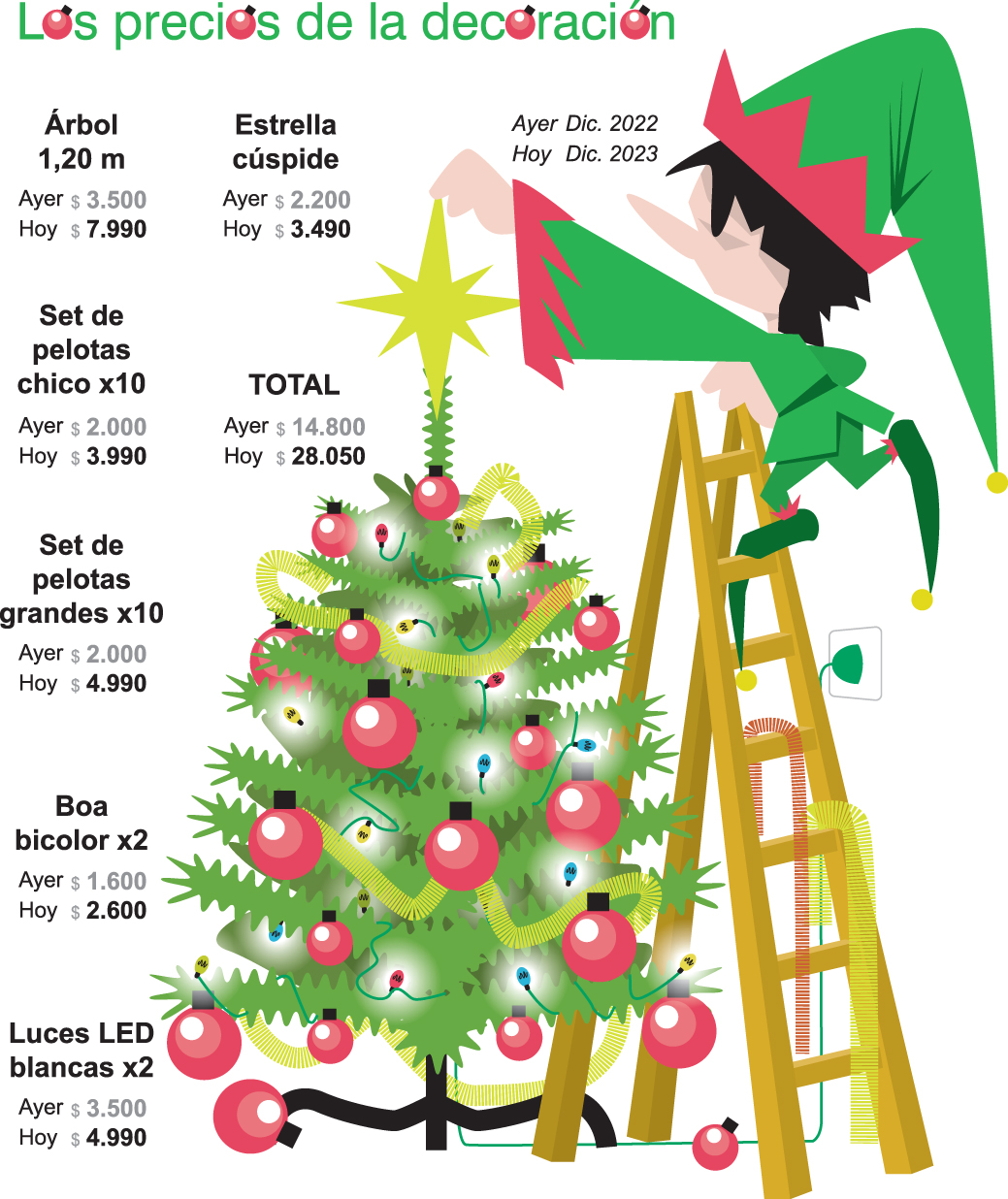 El efecto de la inflación hizo que, en este año, los artículos para la decoración navideña sean desde un 126 hasta un 185 por ciento más caros. El aumento más elevado se registró en el tradicional árbol de Navidad, al punto de que casi triplicó su precio con respecto a 2022. A ello se le suma que es el producto más oneroso en la ornamentación de la festividad. Al incorporar otros elementos, como luces, pelotas, boas y una estrella, el armado del arbolito cuesta 28.050 pesos, cuando el set similar se conseguía el año pasado a 13.999 pesos, prácticamente la mitad. Visto de otro modo, el incremento fue del doble.