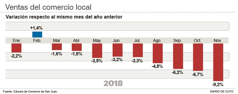 En todos los centros comerciales el lamento es el mismo: las ventas están muy débiles y los negocios tienen que afrontar los costos fijos, así que es preferible resignar el descanso este mes en un intento de salir a flote con las cuentas. Las ventas del comercio minorista sanjuanino se derrumbaron 9,2% en noviembre y convirtieron a ese mes en el peor del 2018 (ver infografía), según la Cámara de Comercio de San Juan. "En lo que va del año las ventas cayeron 3,7% respecto al 2017. El año pasado en los primeros once meses las ventas habían subido 0,6%", dijo su presidente, Hermes Rodríguez. Esa entidad elevó ayer un pedido a la Subsecretaria de Tránsito y Transporte de la provincia solicitando que el transporte público de micros trabaje el sábado con una mayor frecuencia aunque sea feriado, y lo mismo el domingo 23. Hoy esperan la respuesta, pero de todos modos, la decisión de abrir ya está tomada.