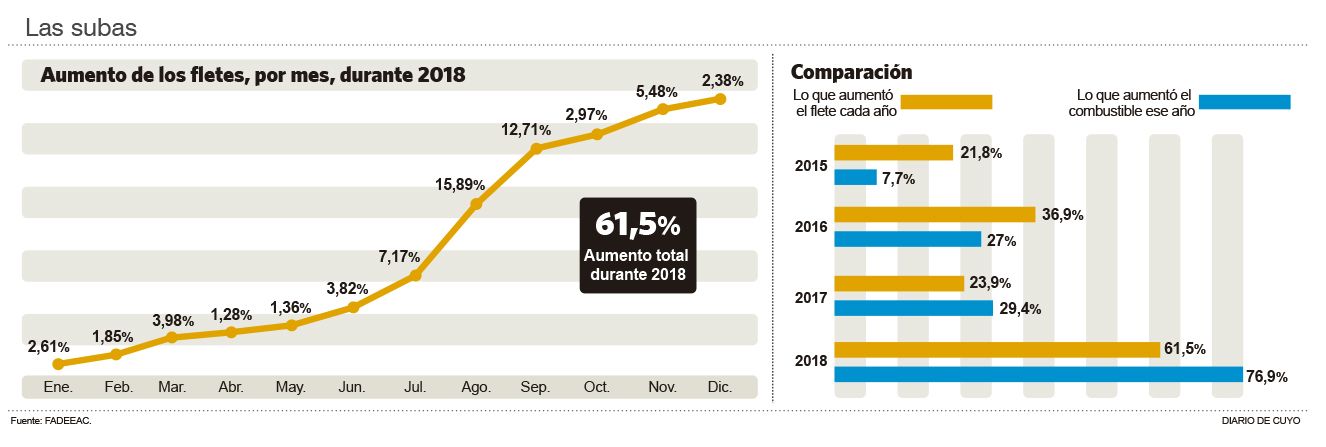 Con el combustible como el principal responsable, el costo de los fletes aumentó el 61,5% durante el año pasado, una cifra que preocupa en el sector transportista porque está a casi 14 puntos por encima de la inflación, que fue del 47,6% durante el 2018. Según datos de la Federación Argentina de Entidades Empresarias del Autotransporte de Cargas (Fadeeac), el número es el mayor de los últimos 16 años porque para encontrar uno superior hay que remontarse al 2002.