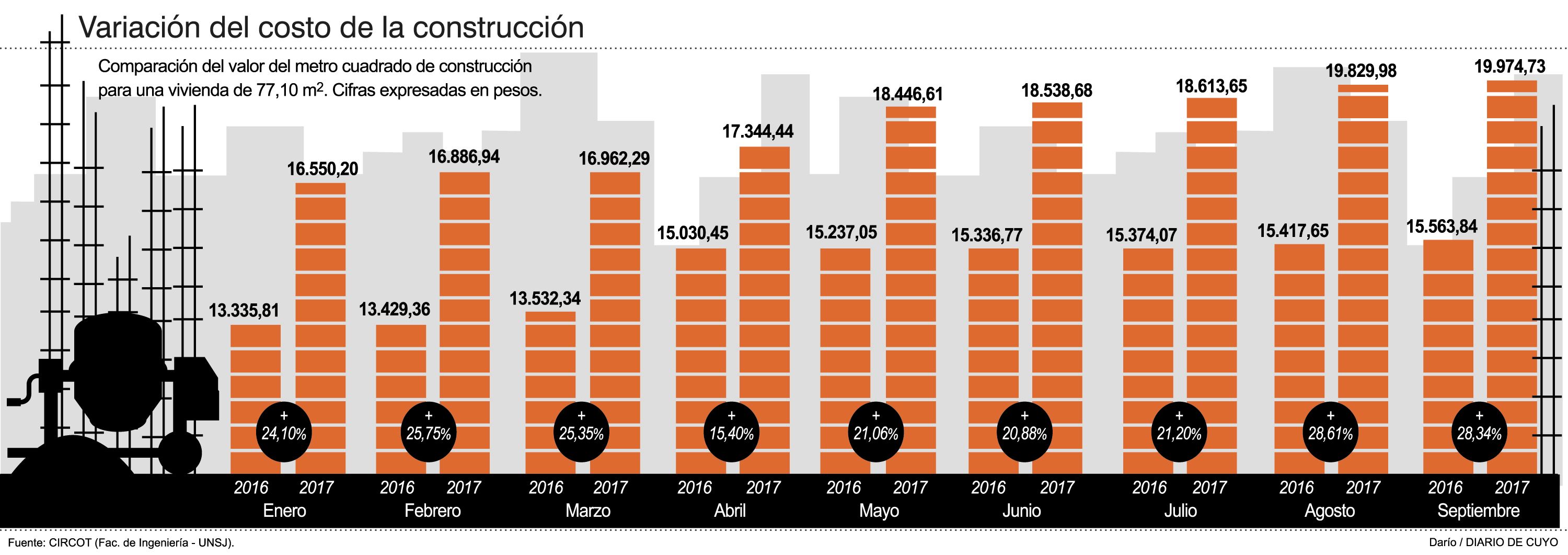 Eso se nota claramente en el costo del metro cuadrado medido por el Centro de Investigación de la Construcción Tradicional (Circot), de la Facultad de Ingeniería local, que en septiembre escaló a $19.974,73, un aumento del 28,34% frente a igual mes del año pasado.