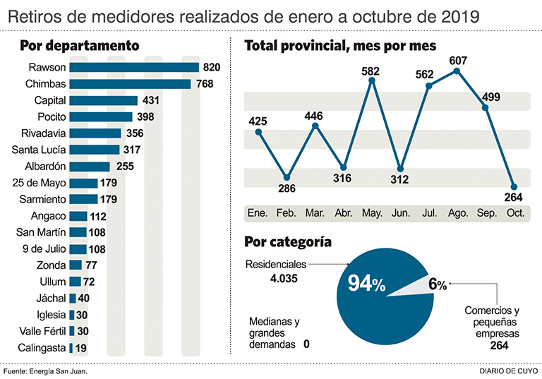 El informe también revela que Rawson lidera el listado de los departamentos con mayor retiro de medidores, que son 820. En el otro extremo del ranking aparece Calingasta, con sólo 19 de esos casos.
