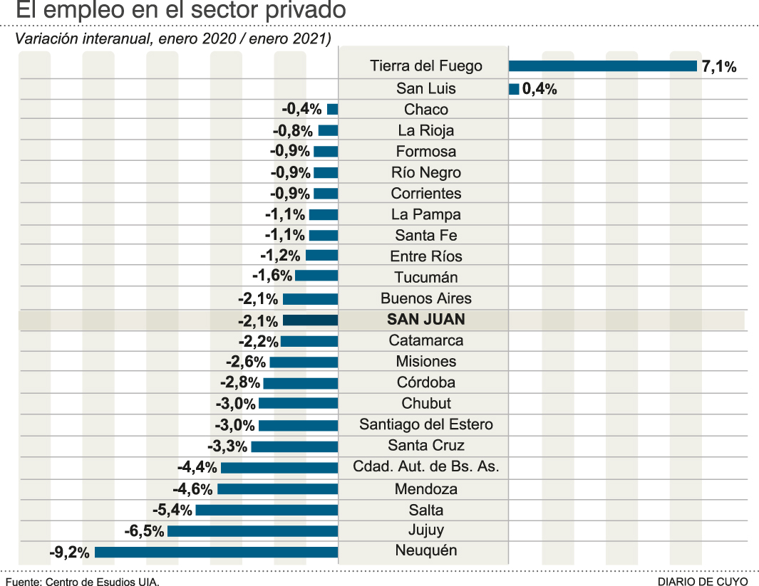 Un informe del Centro de Estudios de la Unión Industrial Argentina (UIA) reveló que mientras en el orden nacional la caída del empleo privado fue del -2,9% en enero de este año, comparado con el mismo mes del 2020, en San Juan la pérdida de puestos de trabajo fue menor, del orden del -2,1%. Según el estudio, casi la totalidad de las provincias argentinas registraron caídas interanuales, con las únicas excepciones de Tierra del Fuego y San Luis y todo por efecto de la crisis sanitaria ocasionada por la pandemia y el freno en la actividad económica.