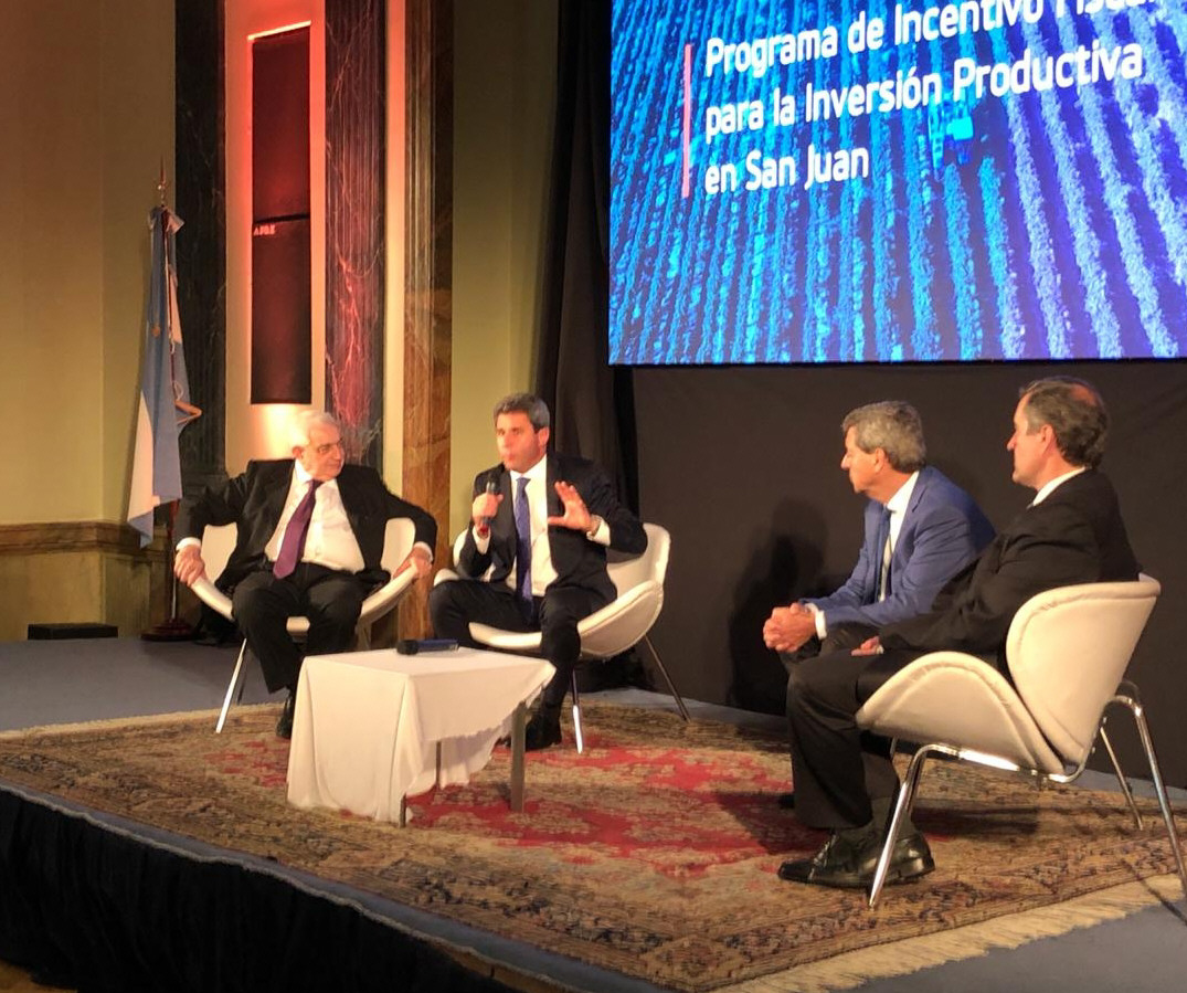 El mandatario provincial estuvo acompañado por el presidente de la Bolsa de Comercio de Buenos Aires, Juan José Adelmo Gabbi. También estuvieron presentes Roberto Gattoni, ministro de Hacienda, y Fabián Ejarque, director de la Agencia San Juan de Desarrollo de Inversiones, quienes previo a la disertación de Uñac dieron detalles del bono fiscal y de otras herramientas que el Estado sanjuanino impulsa para incentivar la inversión.