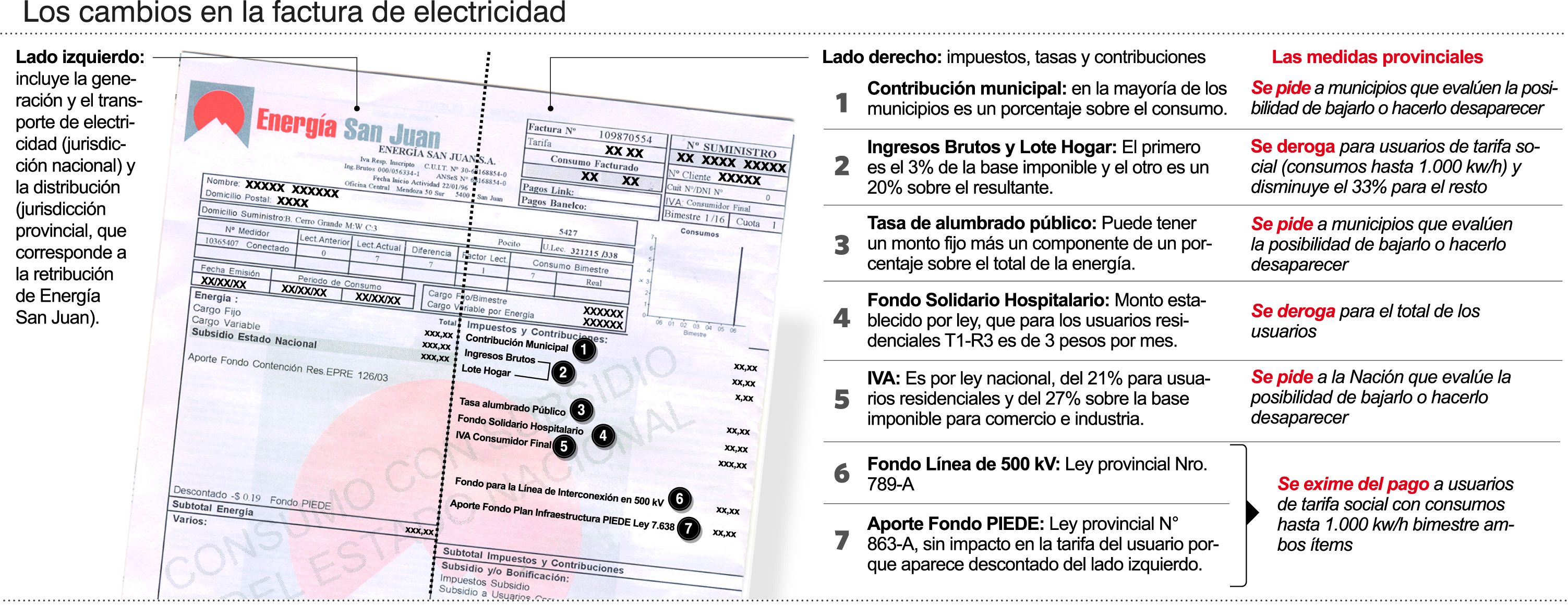 Tal como lo había adelantado a DIARIO DE CUYO el 23 de abril pasado, el gobernador Sergio Uñac anunció ayer el envío inmediato a la Legislatura para su tratamiento este jueves de un proyecto para eliminar y disminuir impuestos y cargos provinciales en la boleta de electricidad con el fin de reducir el impacto del tarifazo en el bolsillo de los usuarios del servicio. Derogará el Fondo Hospitalario (3 pesos), y reducirá un 33% el pago de Ingresos Brutos y Lote Hogar (lo baja del 3,6% al 2,4%) a todos los usuarios, medida que se profundizará para los usuarios de la Tarifa Social que serán directamente eximidos de estos dos últimos cargos, siempre y cuando consuman hasta 1.000 kw/h por bimestre. Este sector más vulnerable también será exceptuado del cobro del Fondo Piede y la línea de 500 (ver infografía).