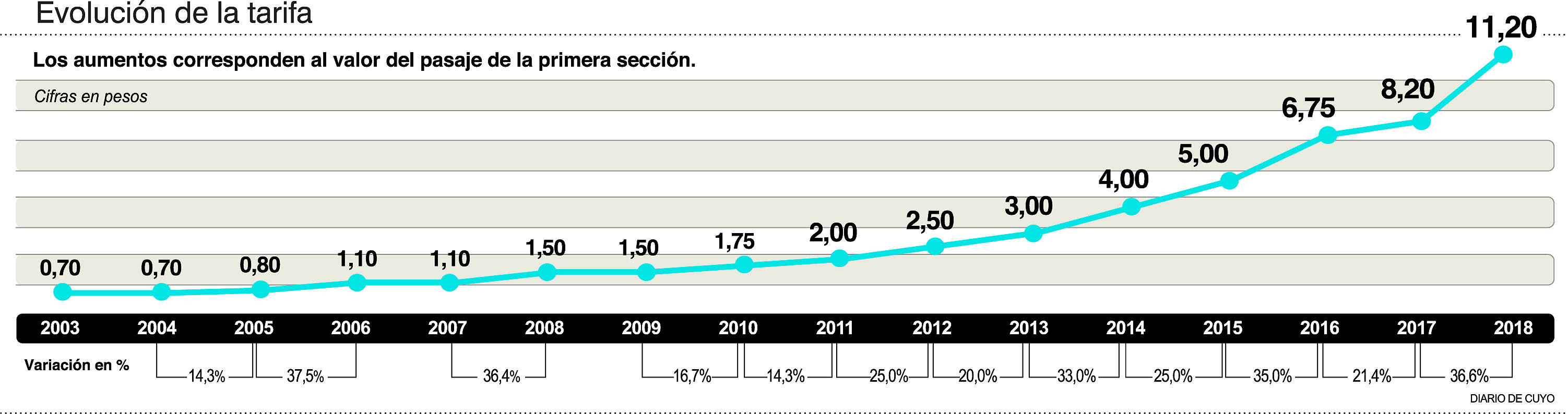 Desde el 2 de enero pasado, la primera sección de la SUBE trepó a los 11,20 pesos (ver infografía), desde los 8,20 pesos que costaba hasta ese momento. La segunda sección subió a 12,29 pesos y antes valía 9 pesos. Mientras que el escolar pasó a tener un costo de 3,20 pesos, es decir de 70 centavos más. Esta última franja del servicio es un monto único para toda la provincia, a excepción de departamentos como Jáchal, Iglesia, Calingasta y Valle Fértil.