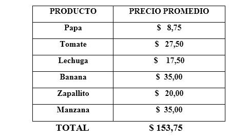 • El total de $ 143,75, es lo que el cliente gastaría en la compra de 1 kg. de frutas y verduras, habitualmente más vendidas esta semana.