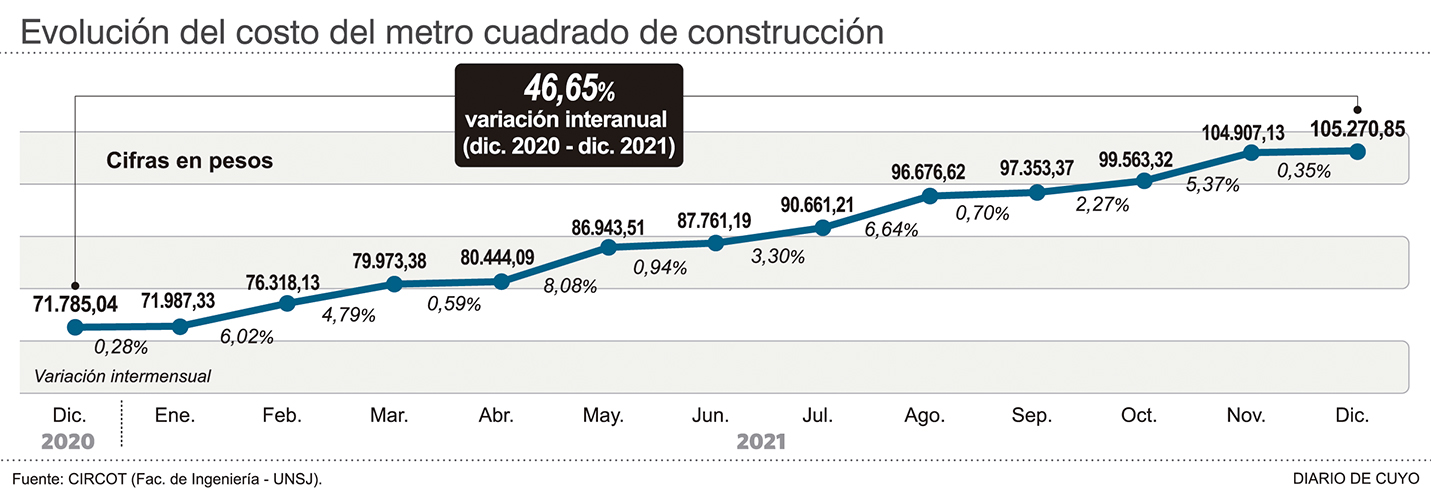 El sueño de la casa propia se aleja cada vez más para miles de sanjuaninos. Mientras en diciembre de 2020 hacían falta 94 sueldos para que un asalariado pudiera construirse la casa, este mes con la suba que ha tenido el costo de edificar el mismo empleado tendría que destinar 122 salarios completos, es decir 28 sueldos más que hace un año para una vivienda de las mismas características. El metro cuadrado aumentó este mes un 46,65% y lo ubicó a $105.270,85, comparado con los $71.785 que costaba en diciembre de 2020 (ver infografía), de acuerdo a los datos que releva el Centro de Investigación para la Racionalización de la Construcción Tradicional (Circot) en la Facultad de Ingeniería. El cálculo es para una vivienda planta baja de 3 dormitorios con una superficie de 77,10 m2, que termina costando, una vez deducidos los costos directos y los indirectos (obrador, gastos financieros, impuestos) en diciembre de 2021 nada menos que $8.116.382,62. Al tomar como ejemplo el sueldo que cobra este mes un vendedor de comercio (categoría D), de $66.377, se infiere que debería hacer un esfuerzo salarial de más de 10 años para edificar su casa, algo realmente inalcanzable. Raúl Navas, investigador y docente de Circot, dijo que desde enero de 2021 a la fecha se ha producido un aumento sostenido y generalizado de todos los insumos que participan en la construcción de la vivienda del Modelo I. Agregó que el material subió por encima de la mano de obra, un 49,56% contra 42,58%, esta última. La variación del índice respecto a noviembre es del 0,35% debido al aumento del costo de materiales, ya que la mano de obra no sufrió modificaciones.