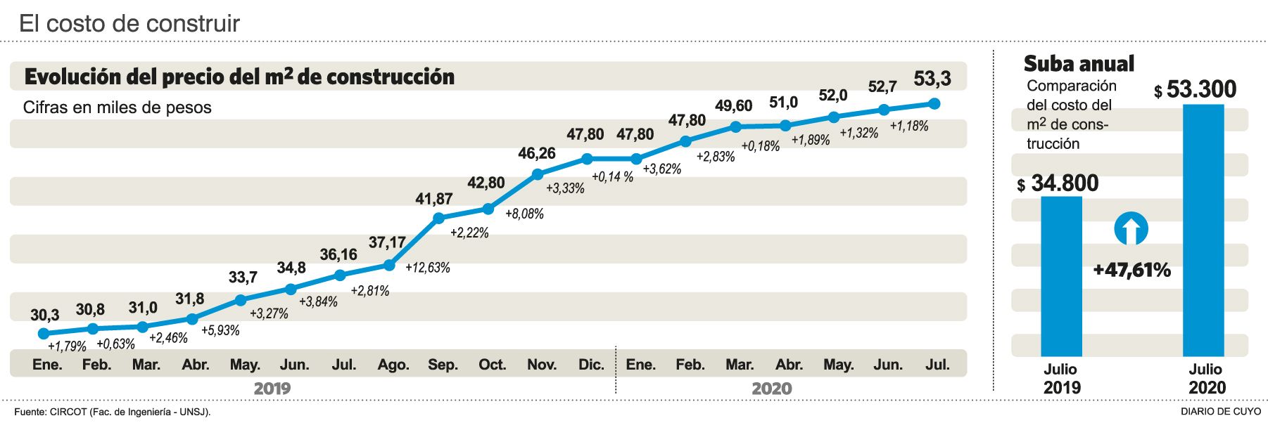 Según el Circot, a pesar de la pandemia que mantiene la actividad a un ritmo bajo, el metro cuadrado mostró un aumento del 1,8% comparado con el mes de junio, y acumula en lo que va del año (enero-julio) una suba del 11,51%, con subas en los materiales de construcción. Hace un par de meses los especialistas de ese organismo explicaron a este diario que a diferencia de otros años, ahora la mayor incidencia en el índice la tienen los materiales de construcción, ya que antes la mano de obra implicaba el 50% del costo y ahora bajó al 40%. Eso se debe también a que por efecto de la crisis económica desatada por el Covid-19, todas las paritarias están congeladas.