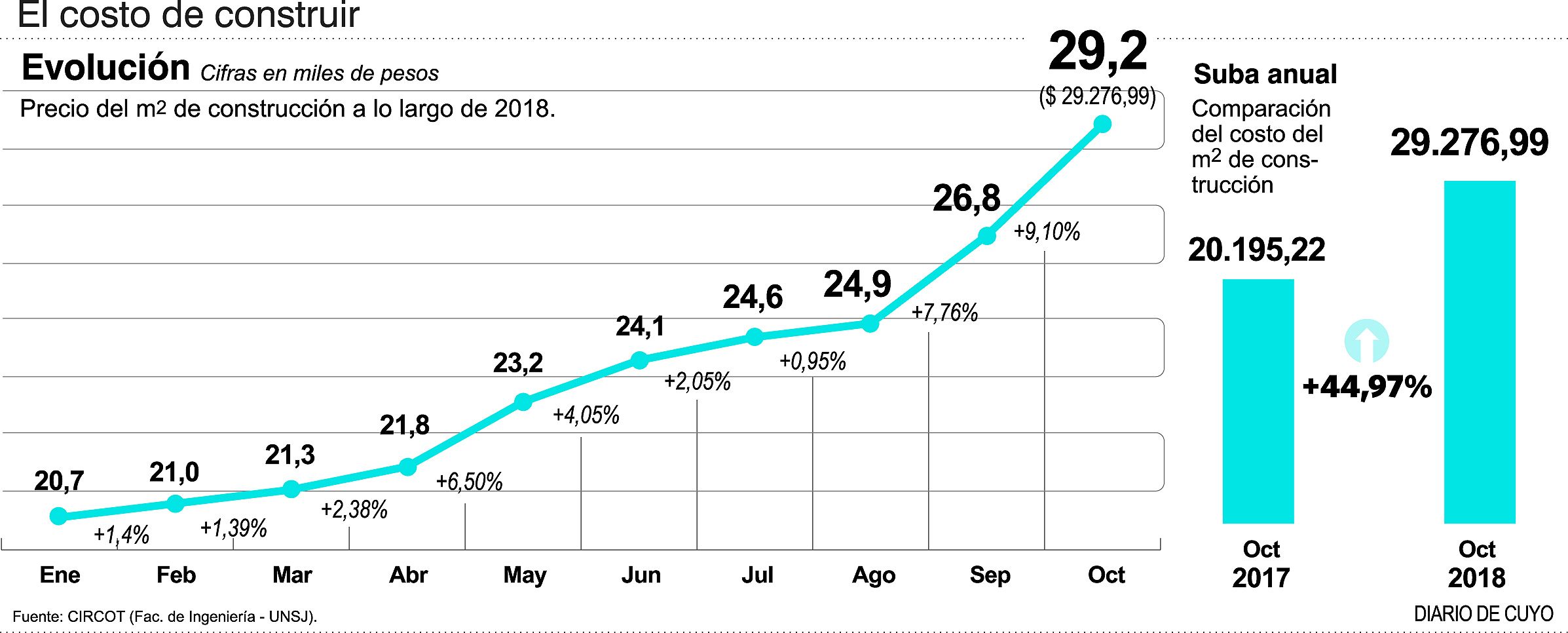 La inflación golpeó fuerte a todos los sectores, pero muy especialmente a la construcción. Si no basta mirar las nuevas cifras para construir en San Juan que acaba de publicar el Centro de Investigación para la Racionalización de la Construcción tradicional (Circot), de la Facultad de Ingeniería: en octubre el valor del metro cuadrado ya roza los 30.000 pesos -alcanza exactamente a $29.276,99 en la provincia- un salto del 9,1% respecto a lo que costaba en septiembre, la suba intermensual más alta en dos años y medio. El antecedente cercano es abril de 2016 cuando subió 11,07%. En la comparación con el año pasado, el incremento trepa al 44.9% porque en octubre de 2017 el costo era de $20.195,22 por m2. Es decir, que en sólo 12 meses el precio de esa unidad se encareció $9.081,77. La mayor aceleración se produjo este año, ya que la variación respecto a enero de 2018 es del 41,27%. En la fuerte suba de este mes tiene incidencia el salto que han pegado los materiales de construcción en general, que aunque no todos tengan precios dolarizados, en el mercado nacional están impactados por las variaciones de la divisa norteamericana. Para el mes próximo también se espera un aumento porque en las paritarias de los obreros de la construcción reabiertas este mes por la cláusula gatillo se decidió un aumento del 4% que se verá reflejado en el cálculo del índice del mes de noviembre, adelantaron desde la Cámara de la Construcción. En términos porcentuales el incremento del m2 es un valor demasiado alto para el bolsillo. Incluso supera ampliamente la inflación del Indec que para los últimos 12 meses es del 34,3%.