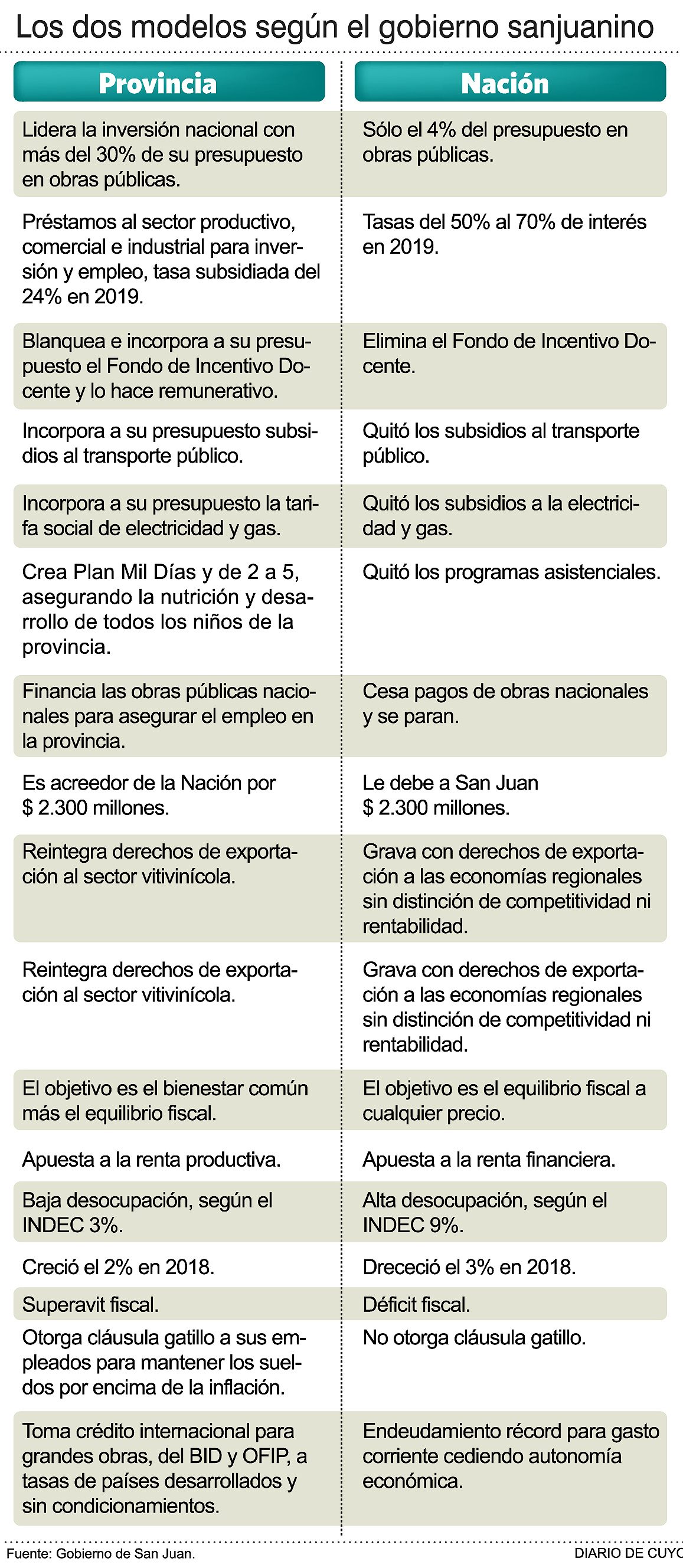 Que hay que mantener el equilibrio fiscal es una cuestión que nadie discute, pero el modo de hacerlo, a costa de los sectores productivos -en particular de las economías regionales- privilegiando la especulación financiera y sin controlar la inflación, como lo está haciendo la Nación; es una cuestión que criticaron cinco economistas consultados por DIARIO DE CUYO. En cambio, elogiaron el modelo local, que ha promovido la inversión en la obra pública para mantener activa la economía, y con políticas activas, como por ejemplo subsidios a la tasa de los créditos y programas de incentivo fiscal para apoyar a las empresas, que son las generadores de empleo. El problema es que éste último no se podrá mantener por mucho tiempo más si no mejora la situación nacional, indicaron todos los expertos consultados.