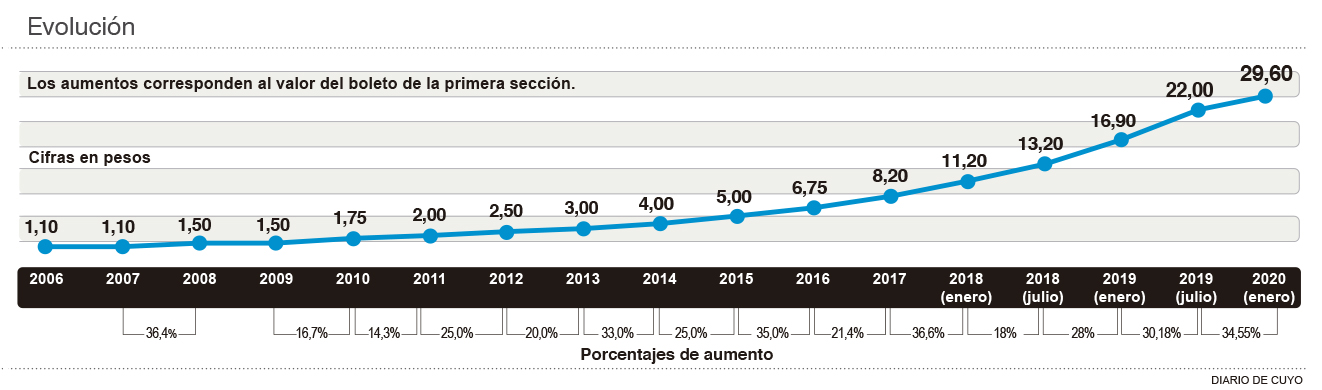 Ayer se conoció que ya está listo para ser firmado por el gobernador Sergio Uñac y su posterior publicación en el Boletín Oficial el decreto que establece un incremento del pasaje del 34,55% para todas las secciones, que lleva el de la primera sección, que es el más utilizado, desde los 22 pesos que cuesta ahora a 29,60 pesos.