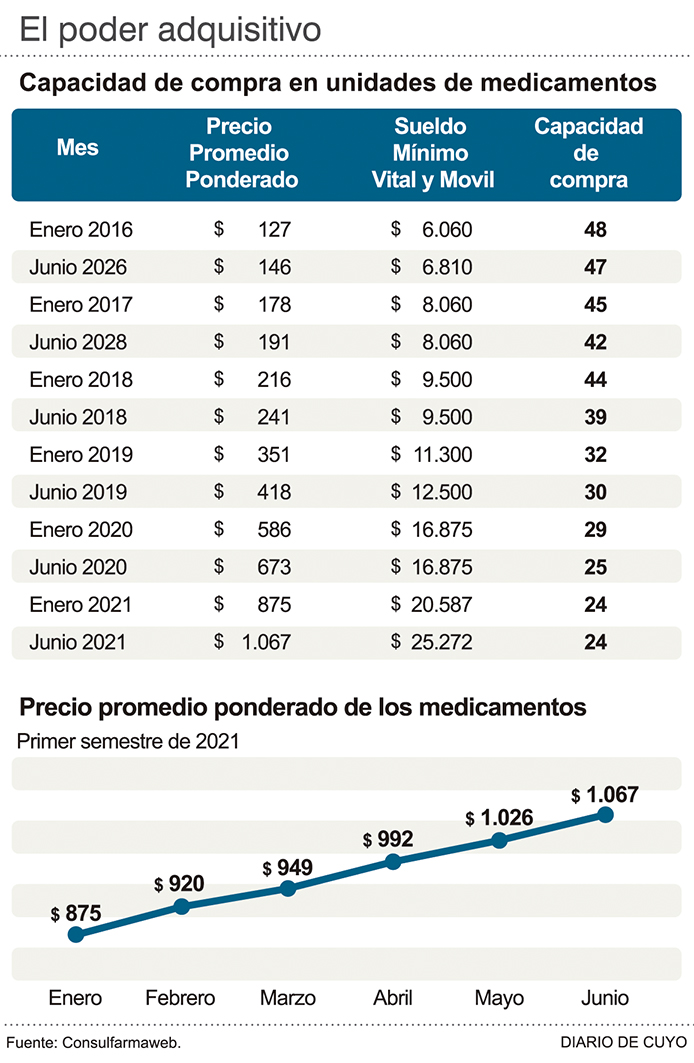 En tanto, el salario mínimo también tuvo incrementos, pero en porcentajes mucho menores. En enero del 2016 el sueldo mínimo era $6.060, y en junio del 2021 fue de $25.272. Significa que el sueldo se cuadriplicó mientras el precio de los medicamentos se multiplicó por más de 8.