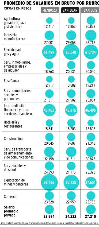 Sin embargo, más allá de la comparación entre sí, las tres provincias de Cuyo se encuentran por debajo del salario promedio privado nacional. Según el Ministerio de Trabajo de la Nación, en mayo de 2018, el salario bruto promedio del país fue de $ 29.462, lo que marcó una brecha del 7,30% con San Luis, del 17,4% con San Juan y del 18,6% con Mendoza.