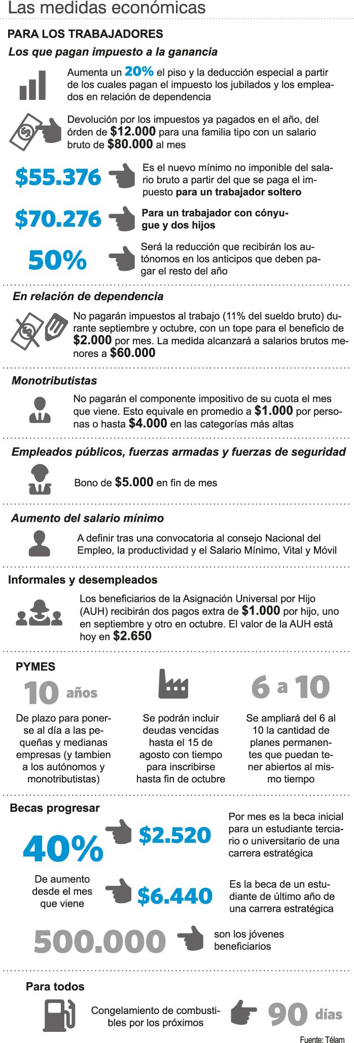 Sube el piso de Ganancias, habrá dos pagos extra de AUH, sube el Progresar, congela las naftas por 90 días, entre otros beneficios.