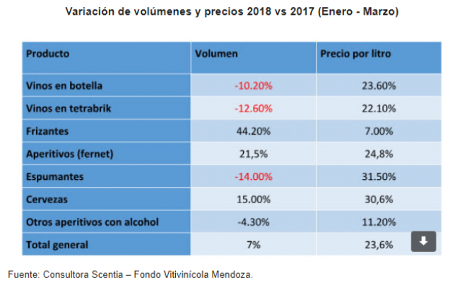 Los aperitivos (principalmente el fernet) crecieron 21% (también con incremento de impuestos internos) y su precio en 24,8%, y los frizantes aumentaron su consumo en un 44,2% mientras que su precio aumentó sólo un 7%.