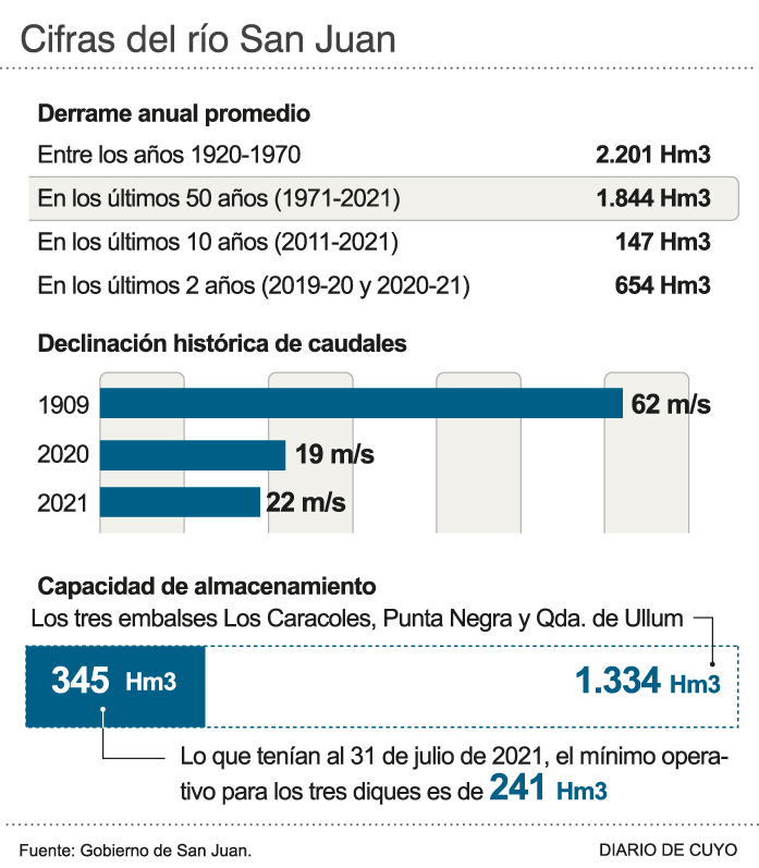 Con el correr de los años, la provisión de agua del río San Juan ha venido bajando en forma alarmante, al punto que en una década ya cubre menos del 50% de lo necesario para llevar adelante la actividad económica. En el 2011; el derrame anual era de 1.147 hm3 y actualmente es solo de 654 hm3. Ese pobre registro del único río que surte al valle de Tulum, Ullum y Zonda se mantiene desde la temporada 2019/20, a raíz de las escasas nieves de la cordillera. Esos datos, y otros acerca del estado actual de los diques, integran el informe oficial que acaba de elaborar el Consejo Provincial para Control de Embalses y Seguridad de Presas (Cocesp), integrado por diversas reparticiones de la Secretaría de Agua y Energía del Ministerio de Obras y Servicios Públicos, tales como el Departamento de Hidráulica, la Dirección de Recursos Energéticos, Energía Provincial Sociedad del Estado y Obras Sanitarias Sociedad del Estado. El Consejo informa que esta temporada hay disponibilidad de agua para todo uso mediante la ayuda de los pozos, pero advierte que será necesario toma conciencia de las características semidesérticas de la provincia, e implementar medidas para cuidar el recurso hídrico. Entre las acciones "extraordinarias" para encarar la sequía el gobierno piensa en automatizar las compuertas de los canales, hacer riego a demanda (según el tipo de cultivo y de suelo) y destinar $2.400 millones en obras para la temporada 2021 y 2022. El documento dice que las actividades económicas del valle que nutre el río San Juan demandan -en base al esquema tradicional de distribución y con las eficiencias de riego actuales- 1350 hm3 anuales. Frente a eso, los derrames de los últimos dos años cubren menos del 50% de lo necesario. Desde 1909 el caudal medio del río es de casi 62 m3/s, pero en los dos últimos años descendió a 22,03 y 19,47 m3/s, respectivamente. Hasta ahora el faltante se sacaba de los diques, pero ahora el almacenamiento de los embalses de Ullum, Punta Negra y Los Caracoles están llegando a su mínima expresión. Las tres represas pueden almacenar 1334 hm3 y al 31 de julio pasado tenían sólo 345,32 hm3. De eso, sólo se puede usar 104,20 hm3, el resto debe permanecer como "embalse muerto" por razones operativas y de seguridad. El informe señala que por años se pensó que los diques era suficientes para mantener los esquemas de distribución de agua, pero dado el profundo y extenso ciclo de sequía todo indica que se deben tomar medidas extraordinarias.