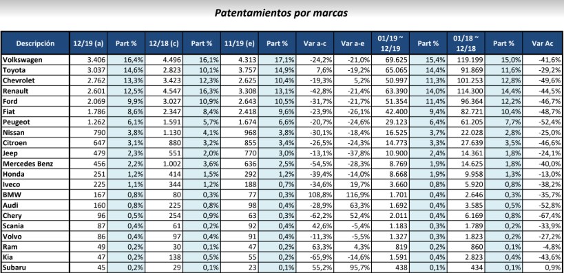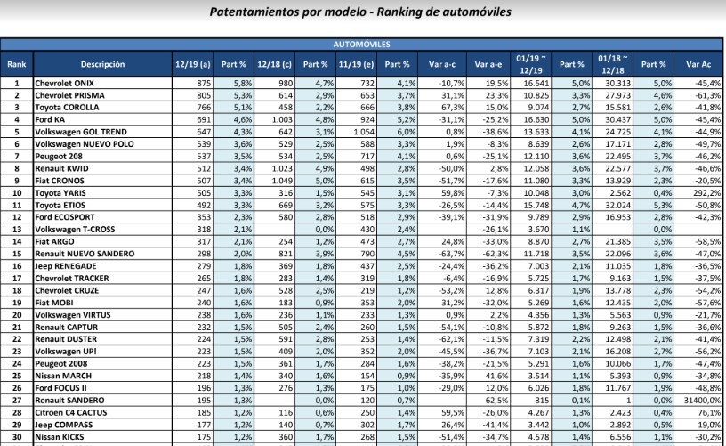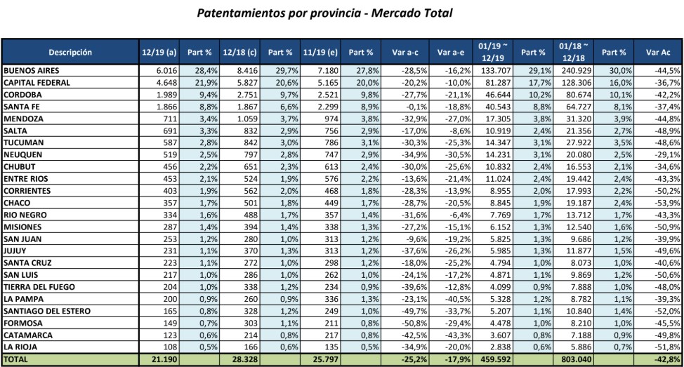 La Asociación de Concesionarios de Automotores de la República Argentina (ACARA) informó que el número de vehículos patentados durante diciembre de 2019 fue de 21.190 unidades, un 17,8 % menos que el nivel alcanzado en noviembre, mes en el que se habían registrados 25.797, y un 25,20% menos en la comparación interanual, ya que en diciembre de 2018 se habían patentado 28.328 unidades.