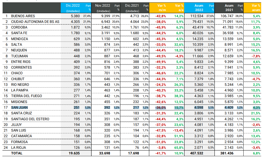 El patentamiento de vehículos 0 Km en San juan durante el 2022 fue un 4,3% mayor que durante todo el 2021, según el reporte dado a conocer por la Asociación de Concesionarias de Automotores (Acara). Mientras que, en el país, el año cerró con 6.8% interanual.