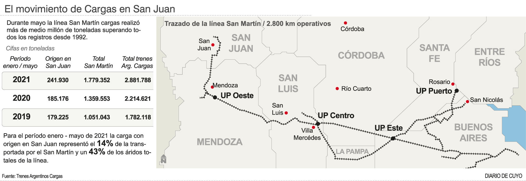 Para el período enero-mayo de este año, la carga con origen en San Juan representó el 14% del total transportada por el San Martín Cargas, encargada del servicio, y el 43% del total de los áridos de la línea. Además, la carga con origen en San Juan tiene una incidencia en la carga total de TAC de más de 8 puntos porcentuales.