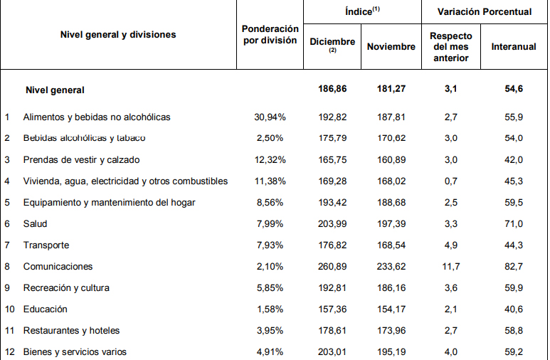 De esta manera, la inflación de diciembre tuvo una variación del 3,1% respecto a noviembre y el acumulado trepó a 54,6%.