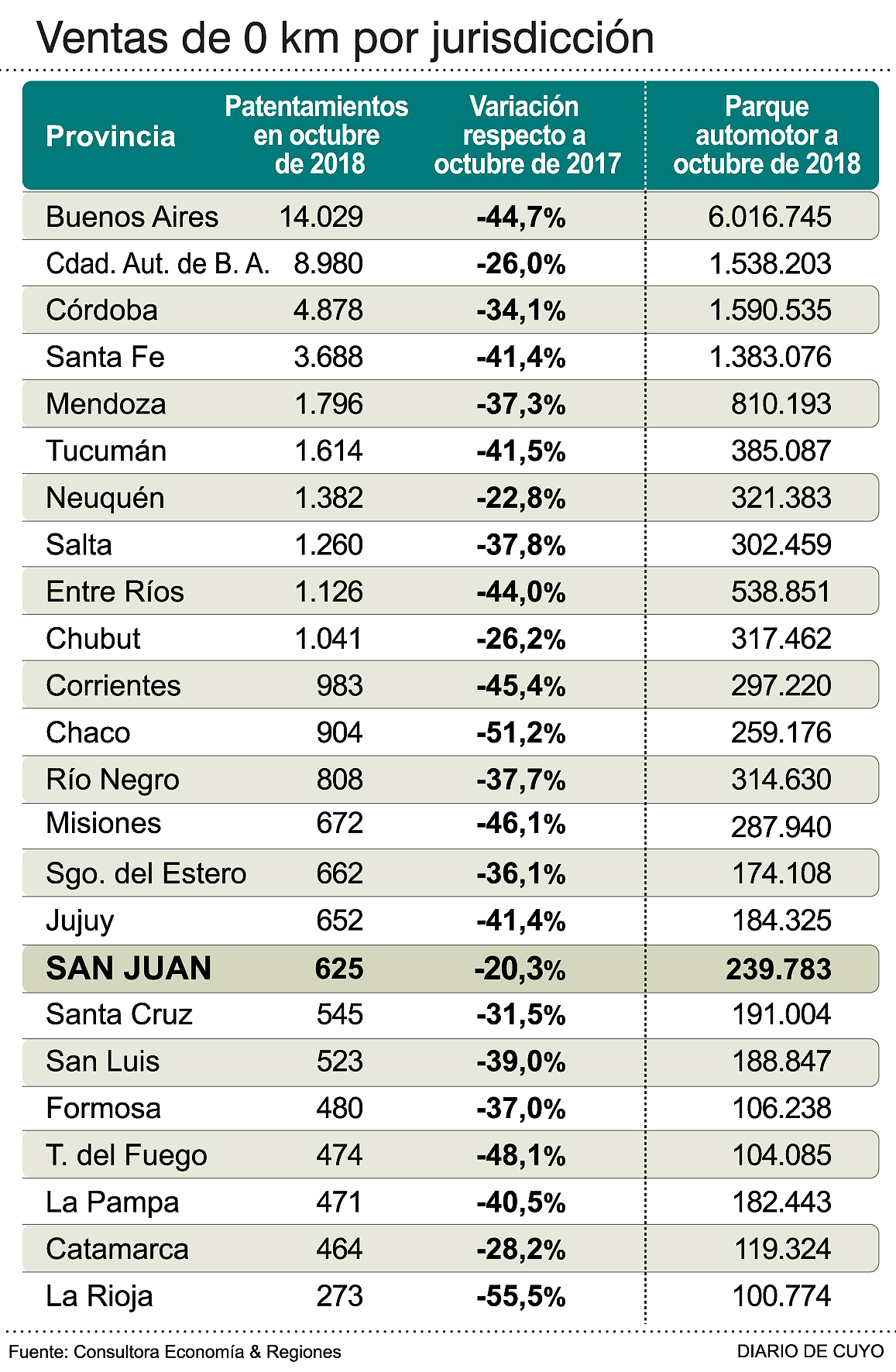 Es que las cuotas están atadas al precio del automóvil, que tras las devaluaciones, acumulan subas del 60 al 70 por ciento en lo que va del año, quedando muy lejos de los aumentos paritarios logrados por los trabajadores que son los principales clientes de los plantes de ahorro. Por el mismo motivo, las suscripciones de nuevos planes se han derrumbado hasta el 53% en la provincia, lo que agudiza la incertidumbre en las concesionarias de coches, porque la mitad de sus ventas se realizan bajo esta modalidad de plan de ahorro. El mes pasado, los patentamientos presentaron una caída del 38,5% en Argentina (ver infografía), y si bien San Juan salió mejor parada -porque las ventas cayeron menos, un 20,3%- en las agencias esperan que la cifra aumente en lo que resta del año.
