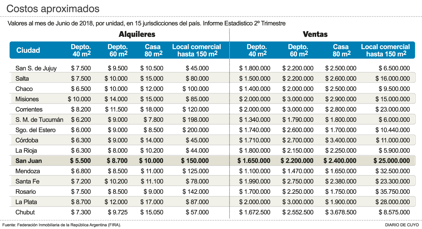 Alquilar en San Juan un departamento de un dormitorio, de unos 40 m2, con un costo de unos 5.500 pesos mensuales, es lo más barato del país, según indica en su informe del segundo trimestre del año la Federación Inmobiliaria de la República Argentina (FIRA). En la otra punta de la tabla se encuentra Misiones, donde el arriendo de una unidad similar tiene un costo de 10.000 pesos. La razón de este fenómeno, que ya se había dado en el trimestre anterior, según fuentes del sector, tiene que ver con la mayor oferta de este tipo de inmuebles y también a que es lo que más se construye en la provincia.