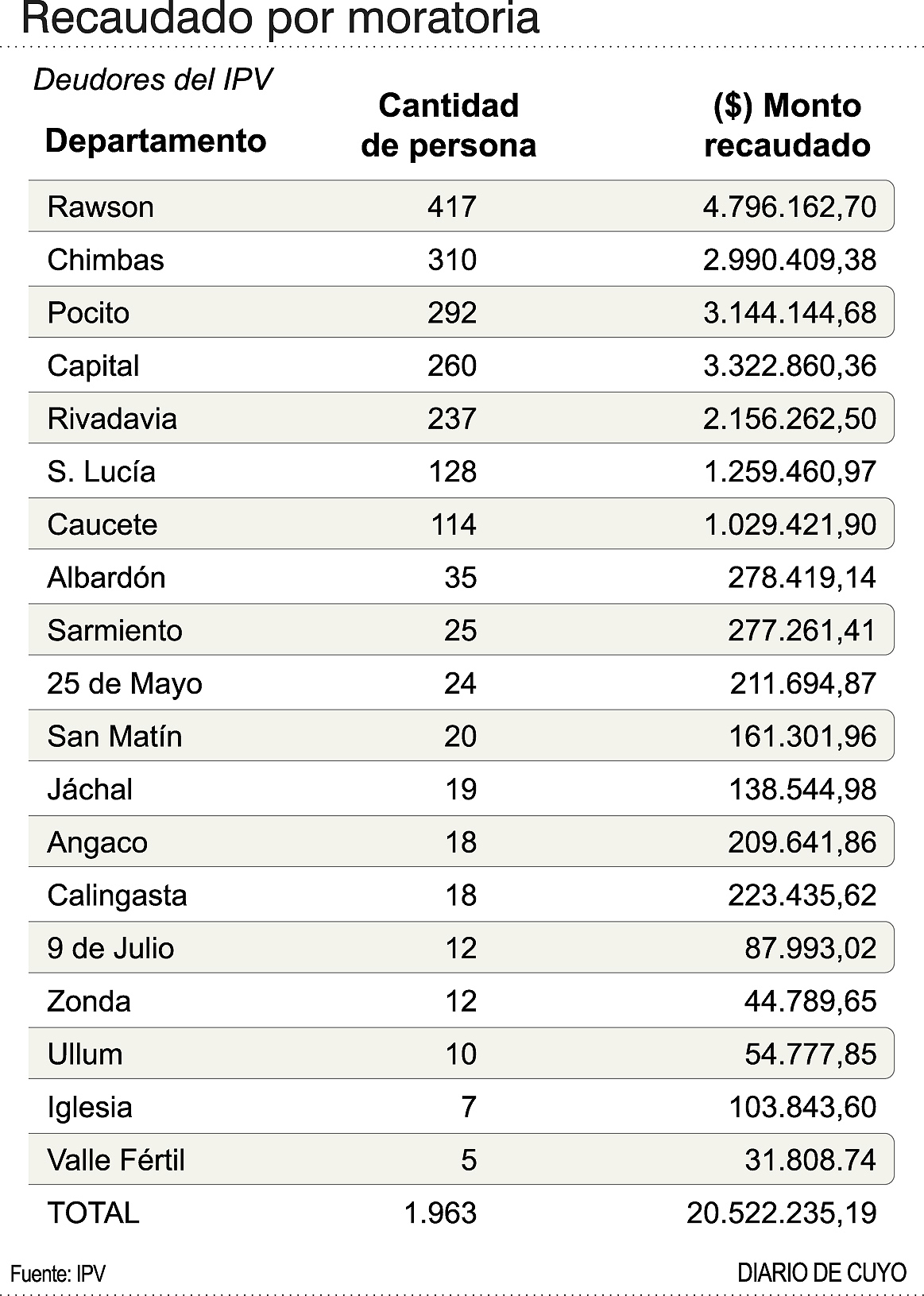 Los adjudicatarios rawsinos encabezan el ránking del plan de normalización de deuda, tanto en cantidad de familias -417- como en el monto regularizado, de casi $4,8 millones, el 23,3% del total (ver infografía). Le sigue el departamento de Capital con 16,19% del monto regularizado, Pocito, con el 15,3%. En cuarto y quinto lugar se ubican Chimbas y Rivadavia, con el 14,5% y 10,5% del total recaudado respectivamente. El último del listado es Valle Fértil, con el 0,15% del total. En cuanto a la forma de pago, el mayor volumen captado es por $7.293.626 en 24 cuotas. Le sigue el pago de contado: Hasta ahora unas 320 familias eligieron pagar la deuda de una sola vez, por un valor que asciende a más de $5,8 millones, el 28% del total. El resto de las opciones (6, 12 y 18 cuotas) tienen un comportamiento parecido, con alrededor de $2,5 millones cada alternativa. Hasta el momento, el promedio diario de recaudación es de $360.000 por día. “”Todo esto lo hacemos porque el IPV debe pensar no solamente en las 70 mil personas a las que el IPV le dio solución habitacional en 65 años, sino en las casi 60 mil familias que hoy no tienen vivienda”, dijo Gimeno. Agregó que el plan de reempadronamiento ha inscripto hasta ahora unas 18.000 personas nuevas.