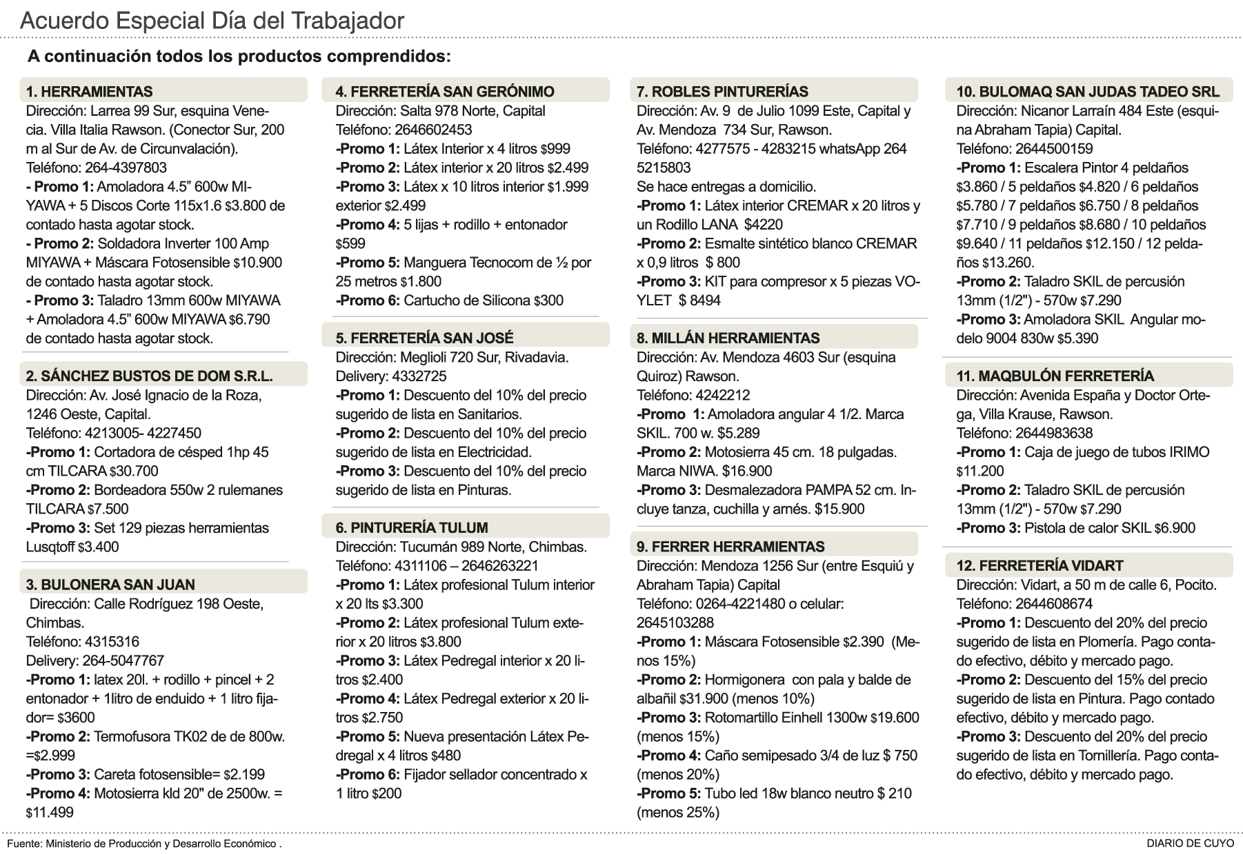 Los negocios están ubicados en Capital, Rivadavia y Rawson, y entre las ofertas se encuentran, por ejemplo, una amoladora por 3.800 pesos, una soldadora por 10.900 pesos o un kit de taladro más amoladora por 6.790 pesos (ver infografía). También hay bordeadoras y cortadoras de pasto y combos que incluyen pintura, lijas, rodillo y el entonador. Otros artículos son en la línea de productos de electricidad y sanitarios con descuentos del 10% y tubos led con 25% de descuento.