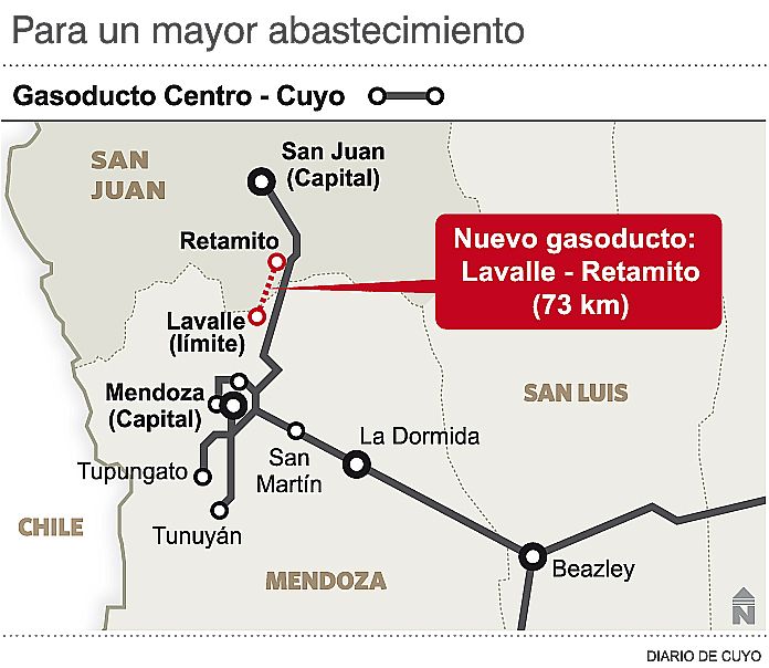 El gasoducto se inicia en Lavalle, en Mendoza, y se extiende hasta Retamito en Sarmiento. Tiene una extensión total de unos 73 kilómetros y cuenta con 12 pulgadas de ancho. El recorrido que realiza se extiende en paralelo al conducto que actualmente provee de gas a la provincia y también viene desde la vecina provincia. En tendido nace en una planta compresora mendocina que quedó habilitada en 2013, recorre varios kilómetros a campo traviesa hasta que finaliza en el departamento de Sarmiento, donde el caño nuevo se une con el ya existente. En general, la cañería está ubicada a 1,80 metros de profundidad y llega en algunos sectores a los 3 metros, para evitar precisamente el problema de de la erosión del agua de las lluvias. Pero harán falta obras de refuerzo porque en el caso de una correntada inusitada podría afectar el caño.