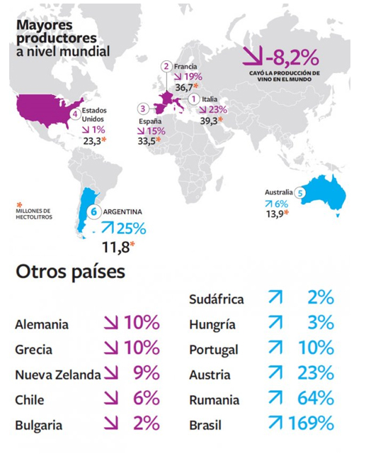 La producción mundial de vino este año ha disminuido 8,2%, hasta los 246,7 millones de hectolitros, el nivel más bajo en las últimas décadas como consecuencia de las adversas condiciones meteorológicas en Europa, y en particular en los tres grandes países, Italia, Francia y España. No obstante, Argentina (sexto productor mundial) y Brasil (14), registraron una subida de la producción de 25% y 169% respectivamente.