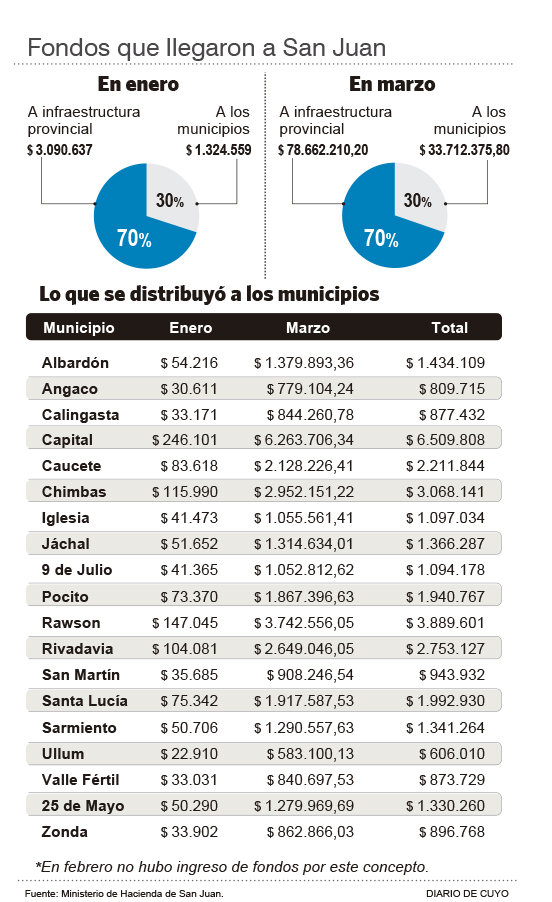 Según los datos que manejan en el Ministerio de Hacienda, en enero llegaron 4,4 millones de pesos, en febrero ni un solo peso y en marzo recién se normalizó la situación y entraron 112,4 millones, que totalizaron 116,7 millones de pesos, frente a los 126,9 millones que habían llegado en el mismo período del año pasado.