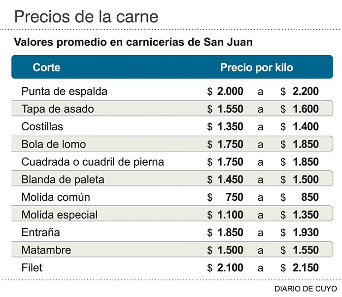 Con esta situación, el kilo de punta de espalda, un corte muy popular en San Juan, ya llega hasta los $2.200, las costillas hasta $1.400, para quienes quieran comerse un asado (ver infografía). Y para quienes piensan en unas buenas milanesas, tendrán que ir preparando el bolsillo para desembolsar hasta $1.850 por el kilo de bola de lomo.